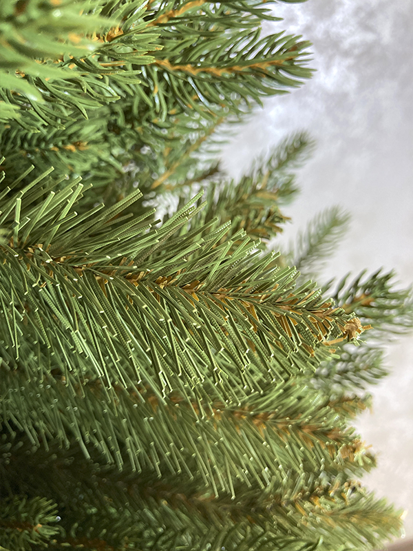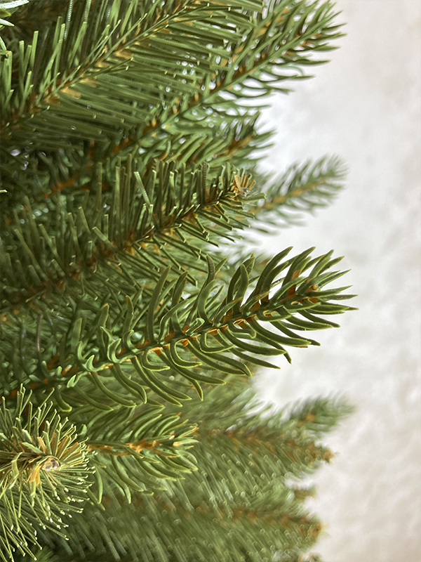 Это красивая елочка, которую почти не отличить от настоящей! В отличие от классической конусообразной формы, она чуть более вытянутая, узкая и стройная. Крона хорошо заполнена, у нее большое количество тоненьких и изящных веточек с иголками из литого пластика. Иголки коротенькие, густо сидят на еловой лапке. На этих веточках так же есть светло-коричневые прожилки, что помогает в точности воспроизвести образ настоящей лесной красавицы. У ели также присутствует небольшое количество веток из ПВХ, которые расположены ближе к стволу, они обеспечивают дополнительную густоту и объем. Хвоя на них средней длины, тонкая и жёстка, она хорошо держит форму. Ветки ВПХ к концам имеют заострённые очертания. Цвет хвои новогодней ёлочки однотонный, зелёный.