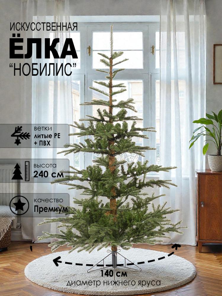 Ёлка Нобилис ― это комбинированное новогоднее дерево с сочетание литых ветвей из PE-полиэтилена и веток ПВХ. Она очень широкая с красивыми раскидистыми ветками, немного приподнятыми к верху. Иголки на литых ветках длинные и толстенькие, лапки массивные и пушистые. Так же на них имеются светло коричневые прожилки. Ветки ПВХ располагаются возле ствола и их немного. Стальной устойчивый ствол дерева задекорирован в коричневый цвет. Крона дерева имеет насыщенный зелёный оттенок. Ветки крепятся к стволу на шарнирах, что позволяет собрать дерево в считанные минуты, достаточно их откинуть и они станут на свои места.