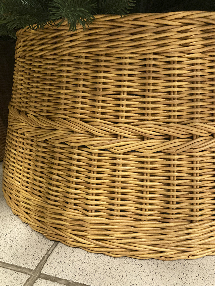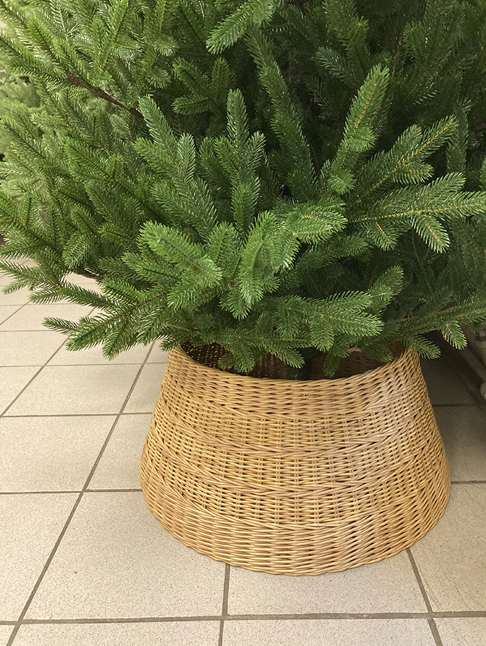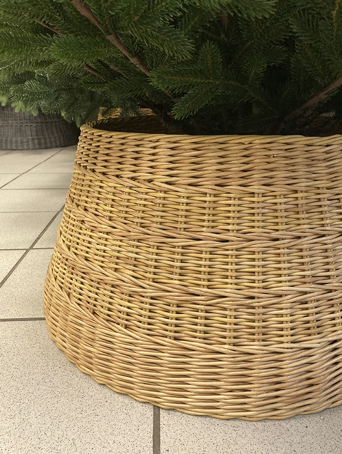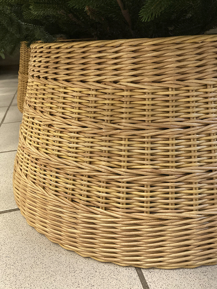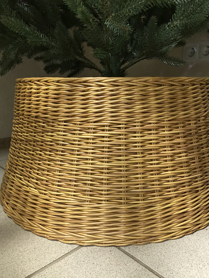 Плетёная корзина под ёлку - это хорошая альтернатива приевшимся подставкам, которые надо постоянно прятать или придумывать как их украсить. Плетёная корзина из ивы смотрится очень красиво. Она придаст ёлочке более натуральный вид, как-будто она живая и растёт из корзинки. Ничего сложного в её установке нет. Сразу ставится корзина, а в неё подставка от ёлки и сама ёлочка.