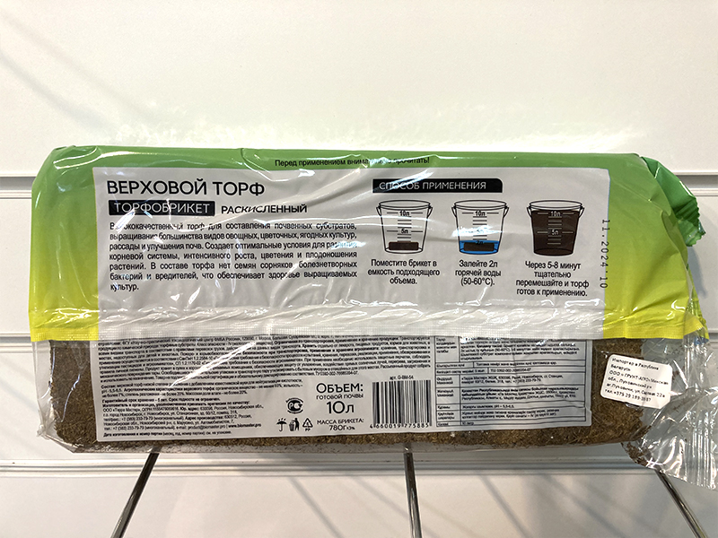 Состав: Верховой торф низкой степени разложения с добавлением известняковой муки для нейтрализации кислотности, pH - 5,5-6,5.