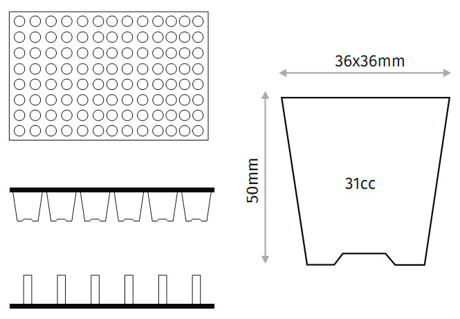 - Размер и объём одной ячейки: 36х36х5 мм, 31мл