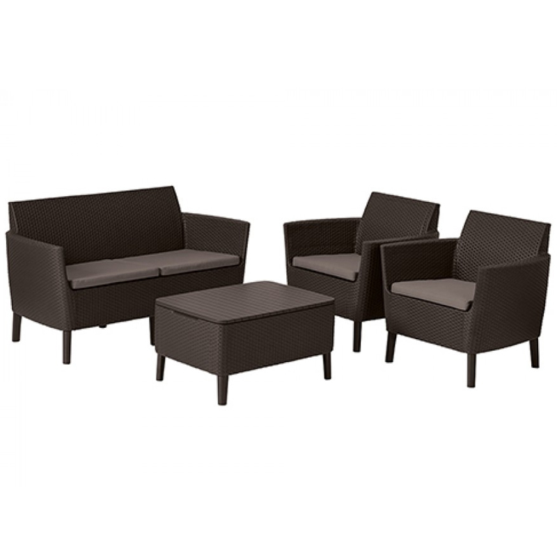 Комплект мебели Salemo 2-sofa set - элегантный стильный комплект мебели Салемо подарит удобство и комфорт. Благодаря современному дизайну скандинавского стиля Salemo с двухместным диванчиком впишется в интерьер террасы или веранды. Набор состоит из 2-х местного дивана, двух удобных кресел и столика. Столик обладает дополнительной функцией - хранение, под крышкой можно поместить дополнительные подушки, пледы, посуду. На диване и креслах предусмотрены мягкие подушки. Продуманная конструкция мебели обеспечивает устойчивость, а пластик, из которого она изготовлена, стойкий к воздействию неблагоприятных погодных условий и УФ-лучей.