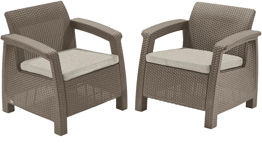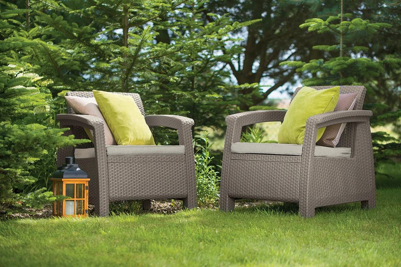 Комплект мебели KETER Corfu Rest — набор пластиковой мебели, состоящий из двух двухместных диванов и двух мягких кресел. Плоское ротанговое плетение. Чехлы на подушках изготовлены из водоотталкивающей ткани. Подходит для использования в ресторанах, в офисах, на курортах, зонах отдыха, в отелях, а также в коттеджах или загородных домах.