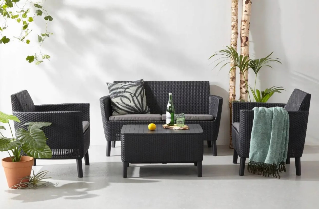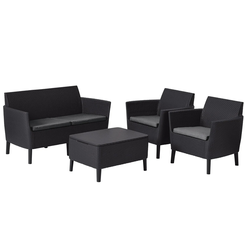 Комплект мебели Salemo 2-sofa set - элегантный стильный комплект мебели Салемо подарит удобство и комфорт. Благодаря современному дизайну скандинавского стиля Salemo с двухместным диванчиком впишется в интерьер террасы или веранды. Набор состоит из 2-х местного дивана, двух удобных кресел и столика. Столик обладает дополнительной функцией - хранение, под крышкой можно поместить дополнительные подушки, пледы, посуду. На диване и креслах предусмотрены мягкие подушки. Продуманная конструкция мебели обеспечивает устойчивость, а пластик, из которого она изготовлена, стойкий к воздействию неблагоприятных погодных условий и УФ-лучей.
