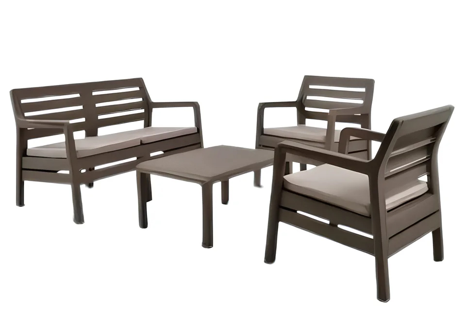 Комплект мебели Delano set - набор мебели с фактурой, напоминающей деревянные панели. В состав гарнитура входят софа, два кресла с подлокотниками и прямоугольный столик. Идеально подходит для использования на домашних балконах, террасах или в саду. Легко собирается и чистится.