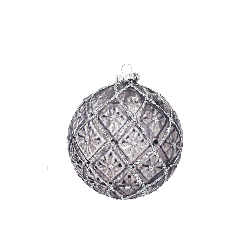 Красивый шар, серого цвета с перламутровой поверхностью и рисунком из блёсток. Смотрится просто потрясающе. Если вы хотите по-настоящему удивить гостей и произвести на них впечатление, украсьте свою елку стеклянными игрушками. Сегодня елочные игрушки из пластика есть в каждом доме, а стеклянные — у единиц!