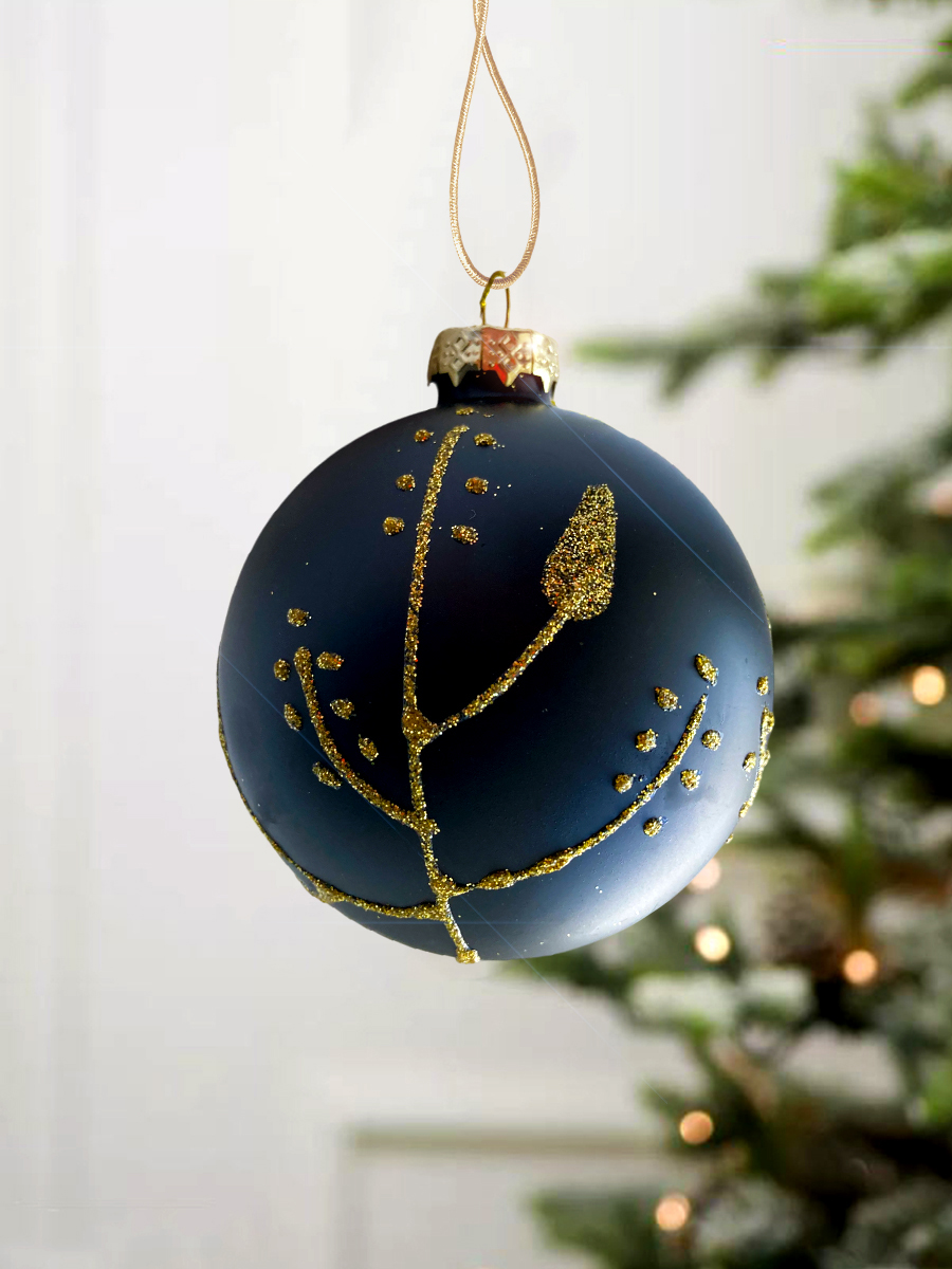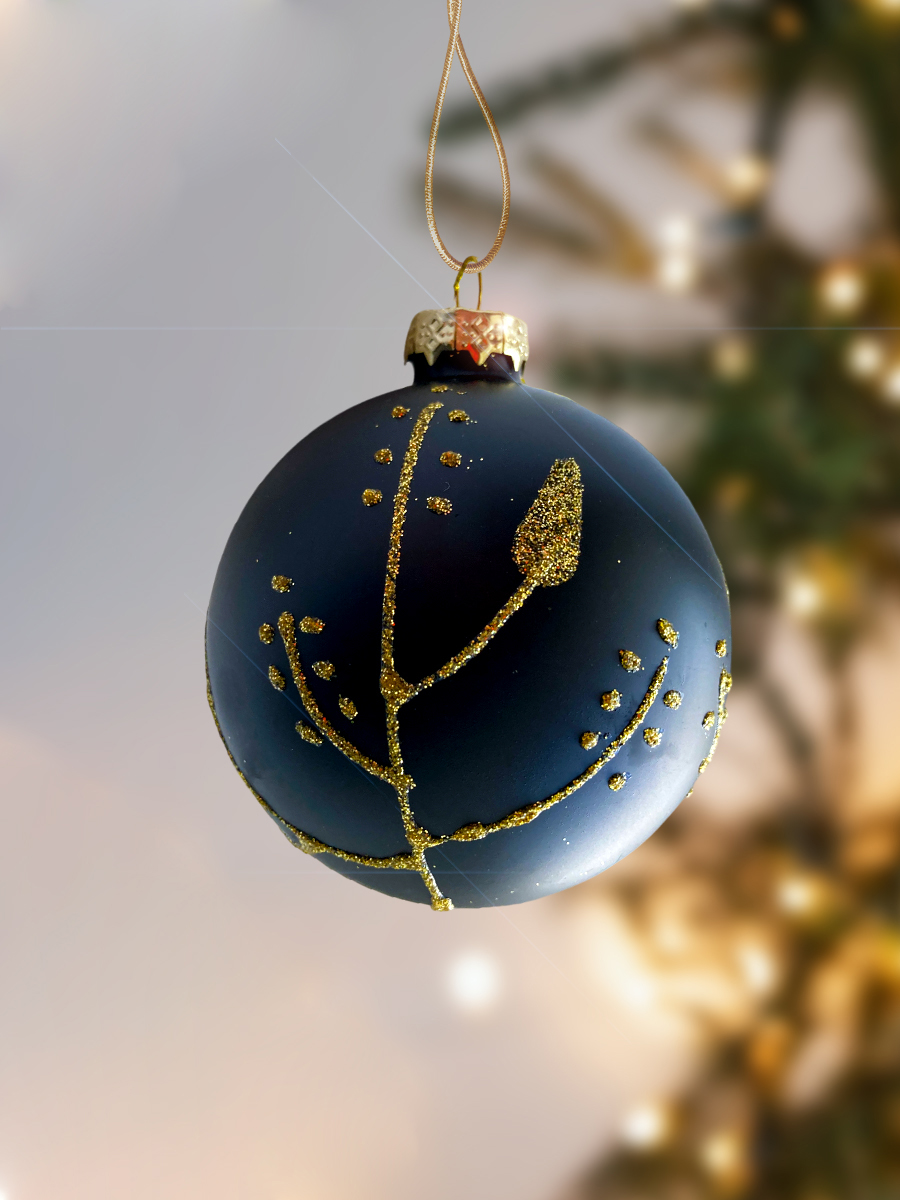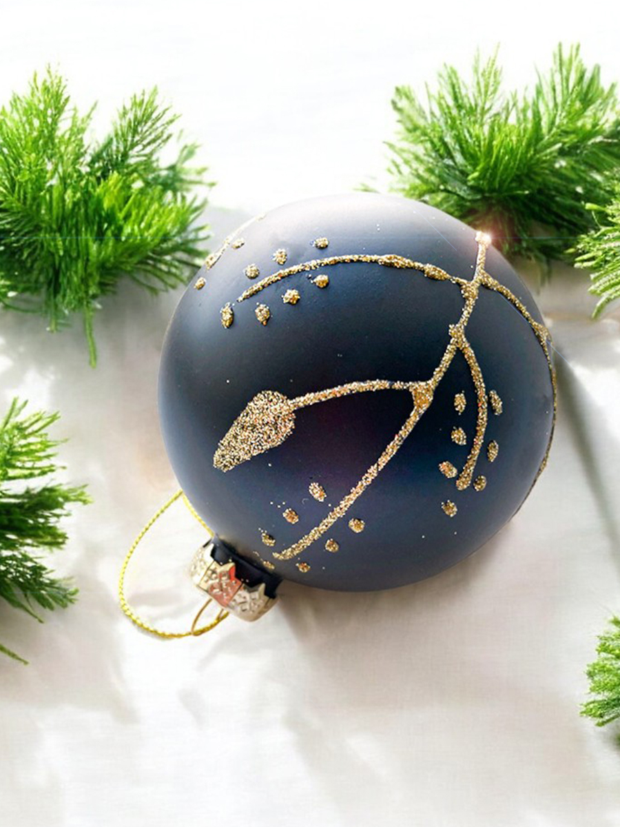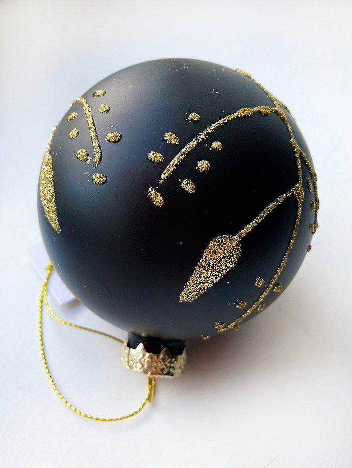 Красивый матовый шар, чёрного цвета с золотистым узором. Смотрится просто потрясающе. Если вы хотите по-настоящему удивить гостей и произвести на них впечатление, украсьте свою елку стеклянными игрушками. Сегодня елочные игрушки из пластика есть в каждом доме, а стеклянные — у единиц!