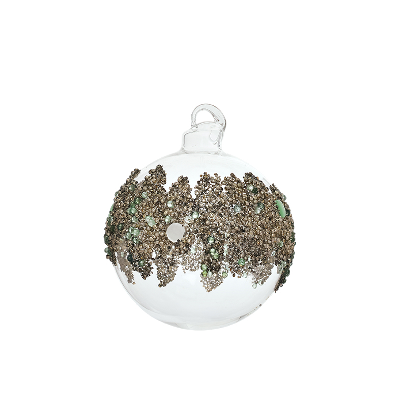 Красивый шар прозрачный шар, в центре украшен декором из бусин и бисера серебристо-зелёного цвета. Смотрится просто потрясающе. Если вы хотите по-настоящему удивить гостей и произвести на них впечатление, украсьте свою елку стеклянными игрушками. Сегодня елочные игрушки из пластика есть в каждом доме, а стеклянные — у единиц!