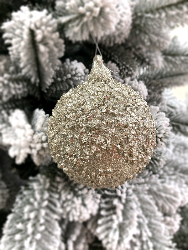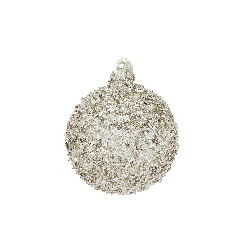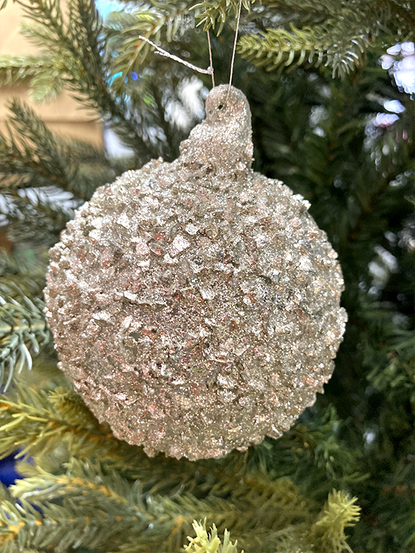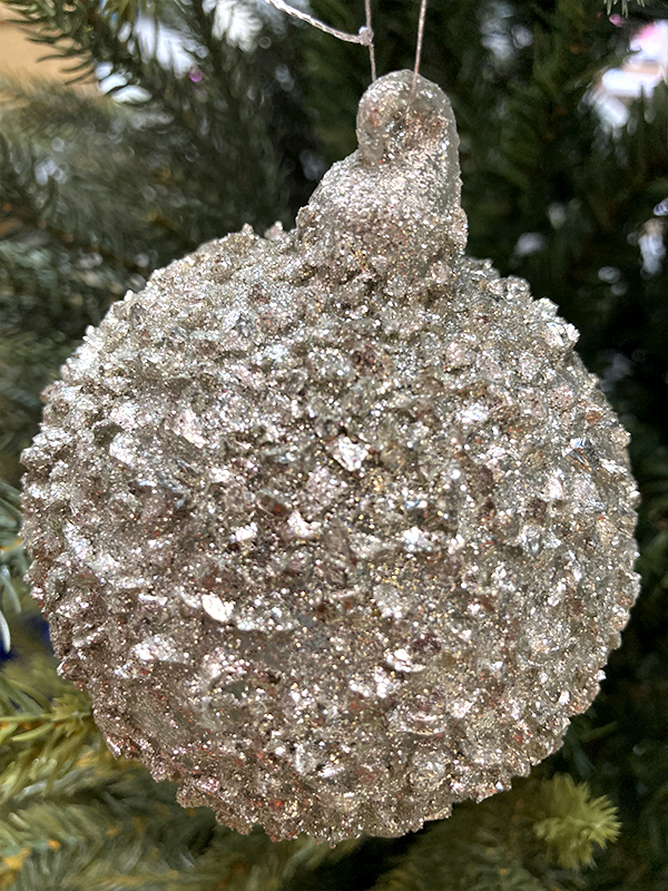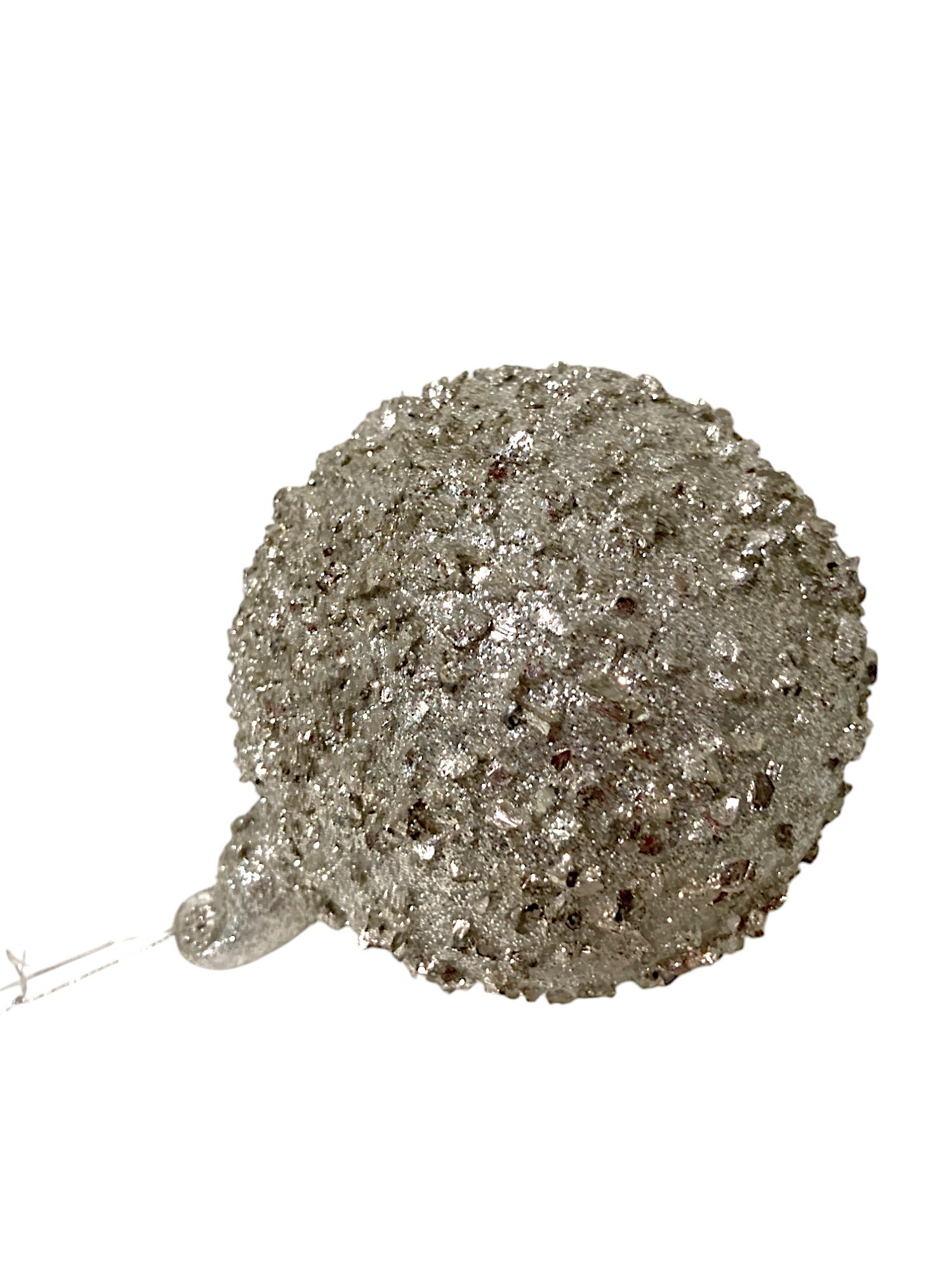 Красивый шар с необычной поверхностью. Шар полностью задекорирован блестящими серебристыми блёстками с вкраплениями небольших осколков камней. Смотрится просто потрясающе. Если вы хотите по-настоящему удивить гостей и произвести на них впечатление, украсьте свою елку стеклянными игрушками. Сегодня елочные игрушки из пластика есть в каждом доме, а стеклянные — у единиц!
