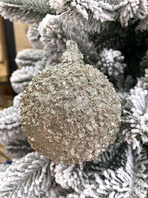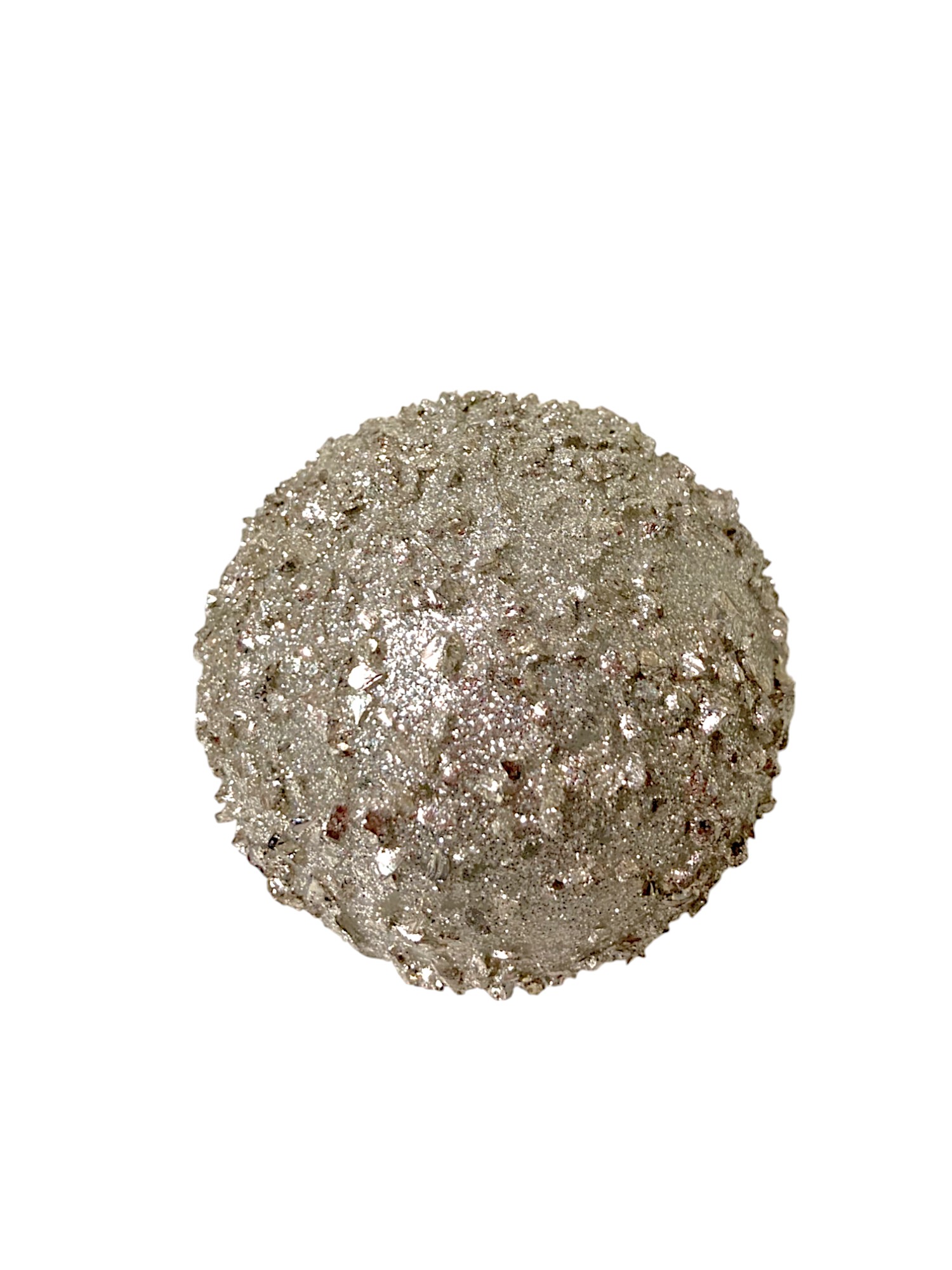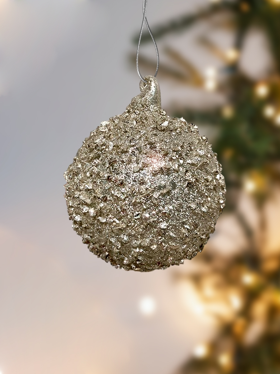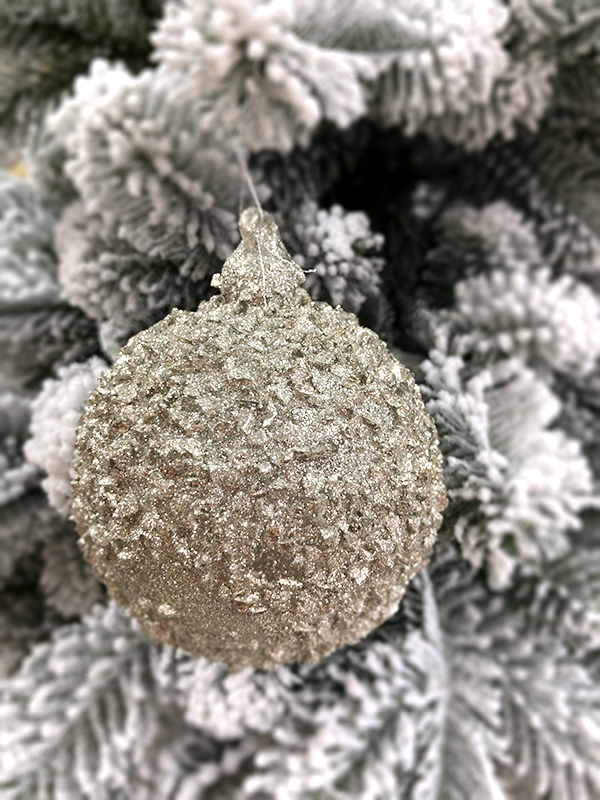 Красивый шар с необычной поверхностью. Шар полностью задекорирован блестящими серебристыми блёстками с вкраплениями небольших осколков камней. Смотрится просто потрясающе. Если вы хотите по-настоящему удивить гостей и произвести на них впечатление, украсьте свою елку стеклянными игрушками. Сегодня елочные игрушки из пластика есть в каждом доме, а стеклянные — у единиц!