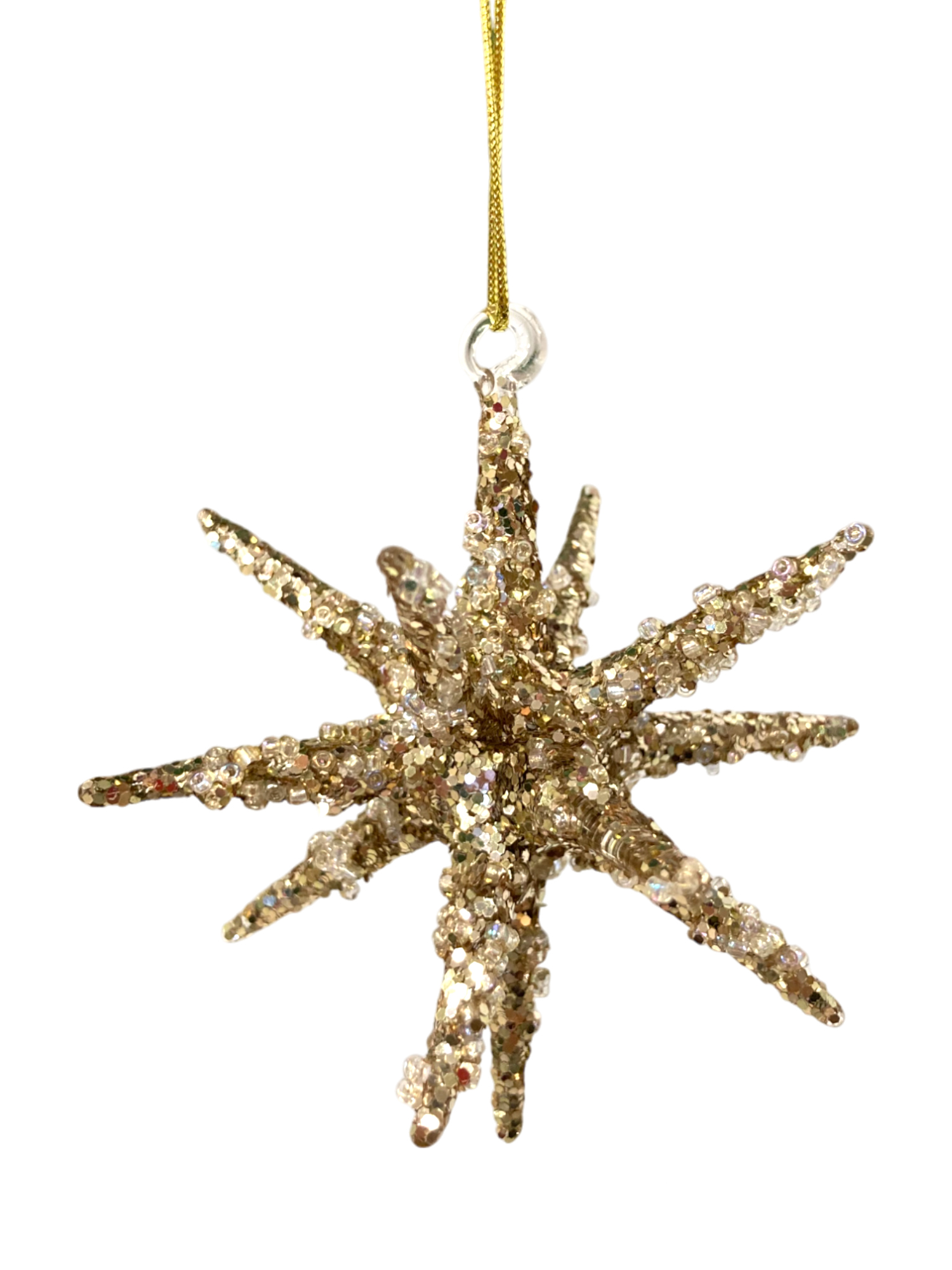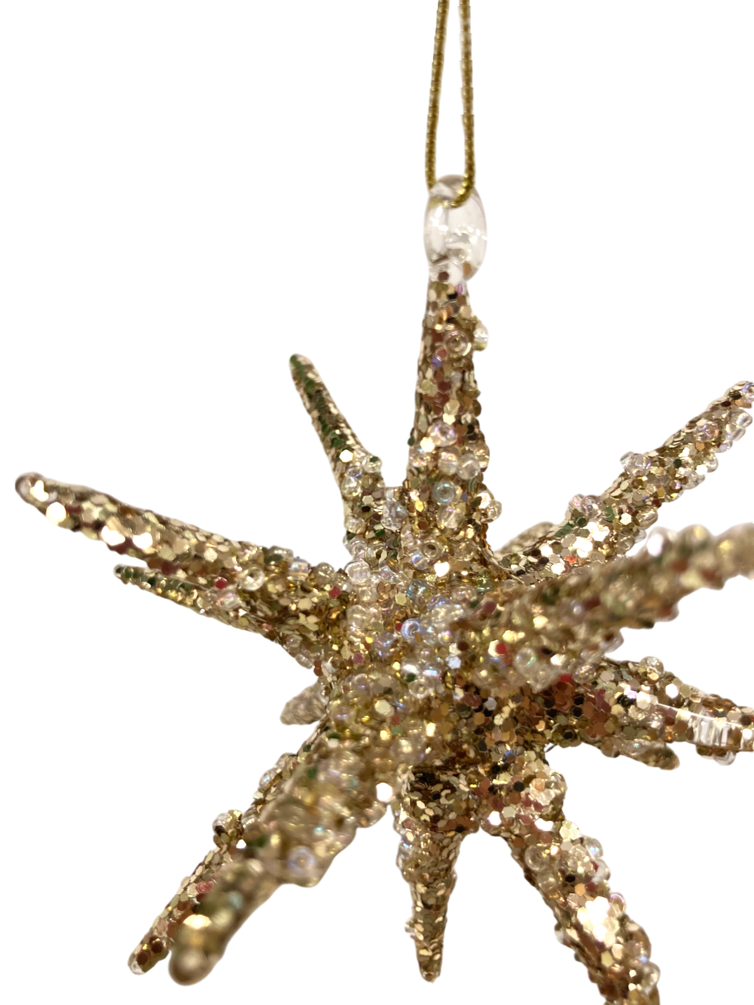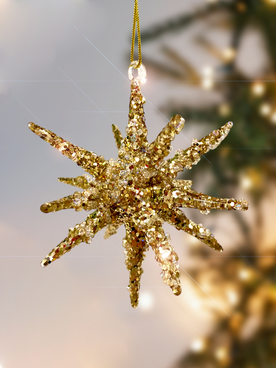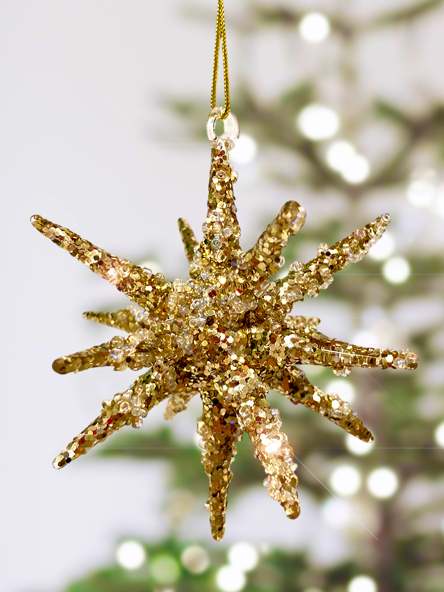Игрушка елочная стекл "Звезда" — новогодняя ёлочная игрушка в виде объёмной золотистой звезды украшенной бисером и блёстками. Она выполнена из качественного стекла и имеет золотистый цвет, который добавит ярких красок в атмосферу праздника. Вешается на ёлку с помощью подвеса. Если вы любите новые, оригинальные идеи и формы, это елочное украшение для вас! Украсьте елку красиво и создайте собственное новогоднее настроение. Если вы хотите по-настоящему удивить гостей и произвести на них впечатление, украсьте свою елку стеклянными игрушками. Сегодня елочные игрушки из пластика есть в каждом доме, а стеклянные — у единиц!