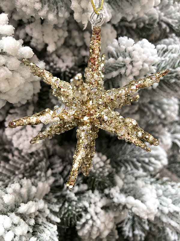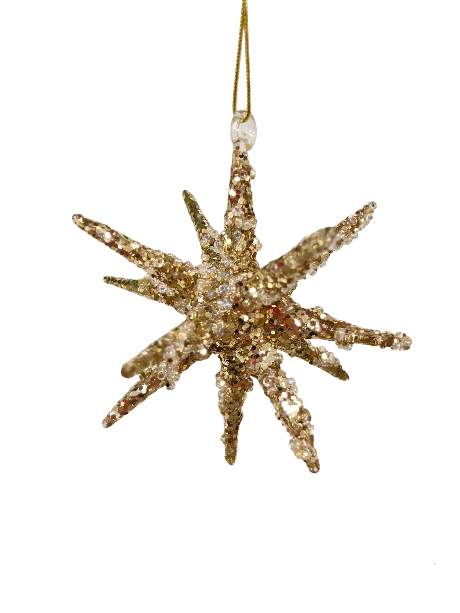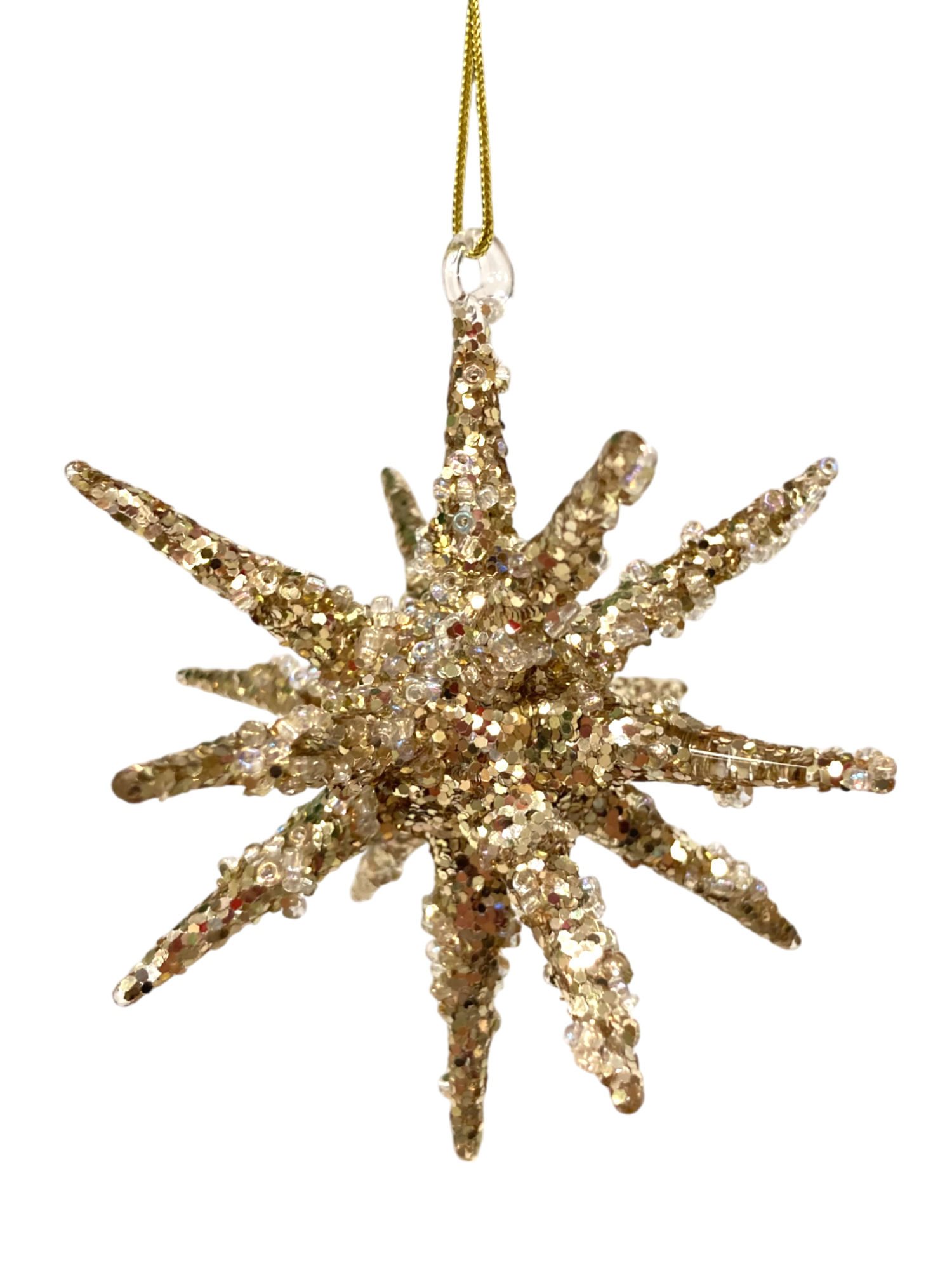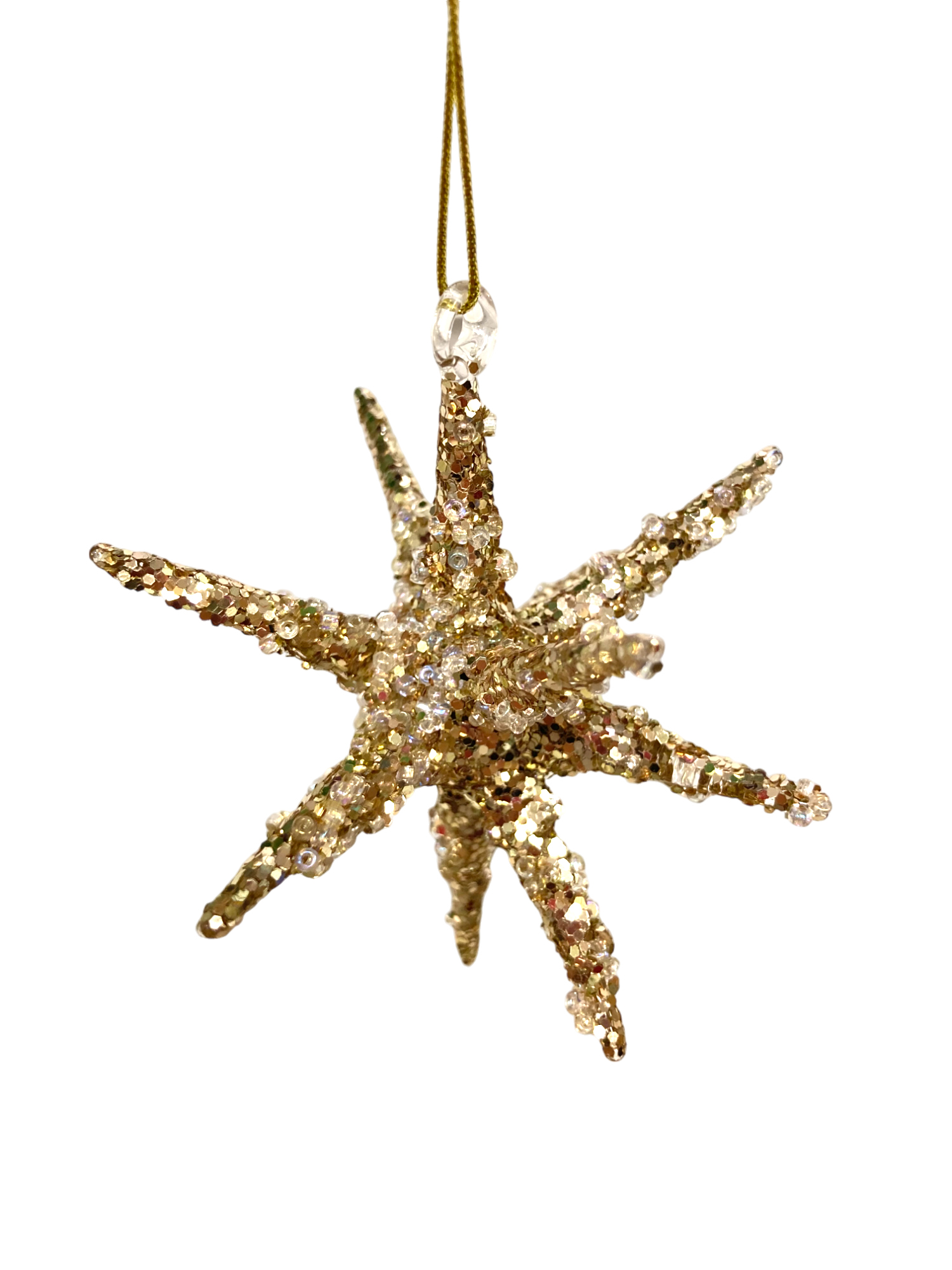 Игрушка елочная стекл "Звезда" — новогодняя ёлочная игрушка в виде объёмной золотистой звезды украшенной бисером и блёстками. Она выполнена из качественного стекла и имеет золотистый цвет, который добавит ярких красок в атмосферу праздника. Вешается на ёлку с помощью подвеса. Если вы любите новые, оригинальные идеи и формы, это елочное украшение для вас! Украсьте елку красиво и создайте собственное новогоднее настроение. Если вы хотите по-настоящему удивить гостей и произвести на них впечатление, украсьте свою елку стеклянными игрушками. Сегодня елочные игрушки из пластика есть в каждом доме, а стеклянные — у единиц!