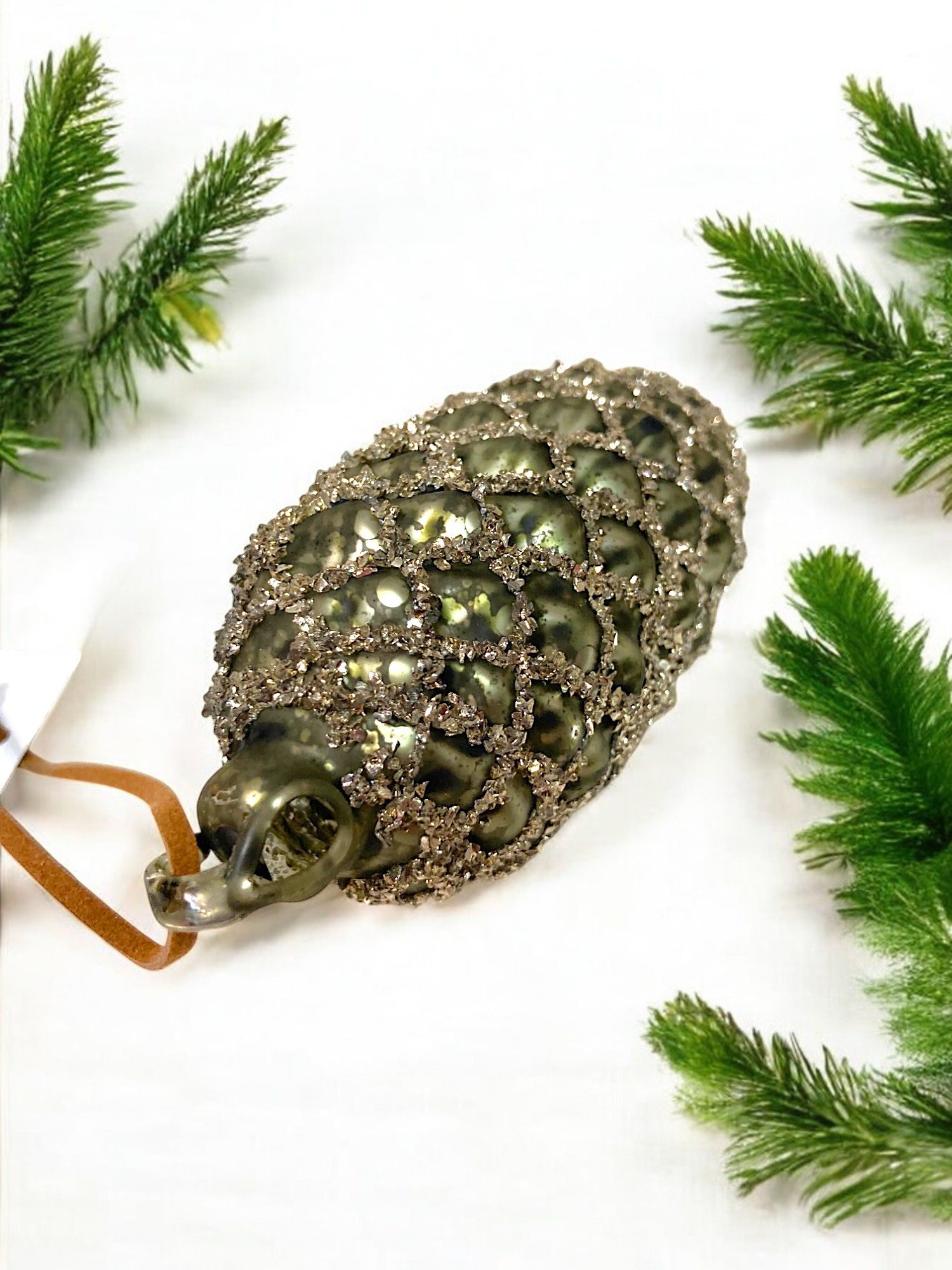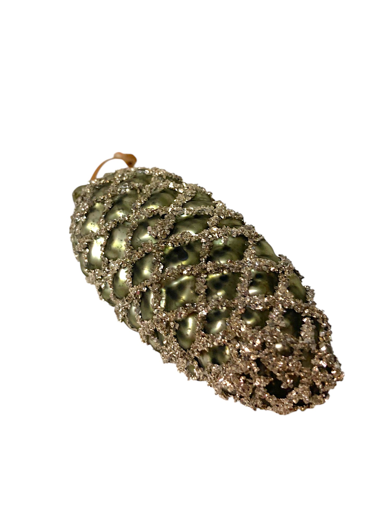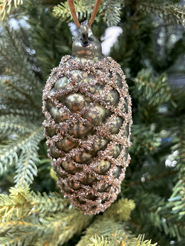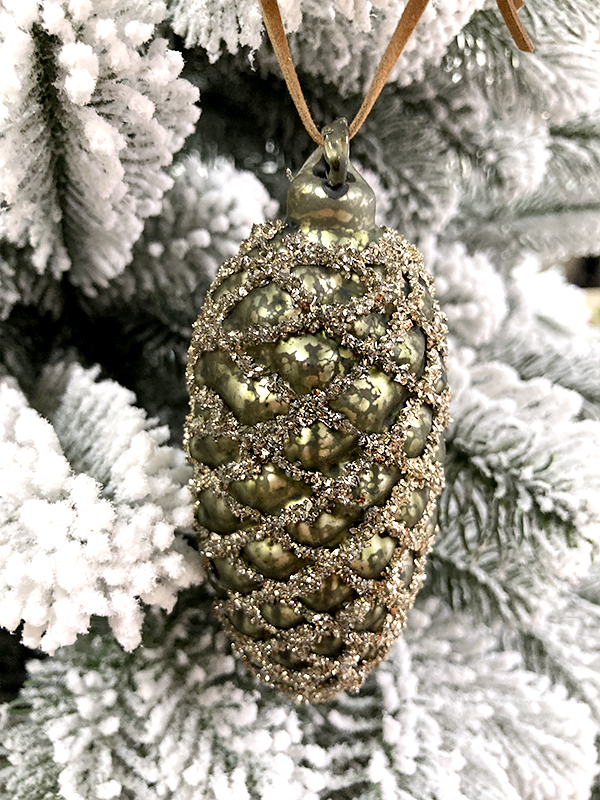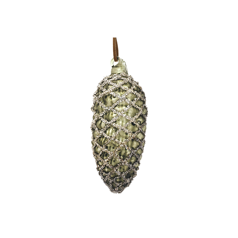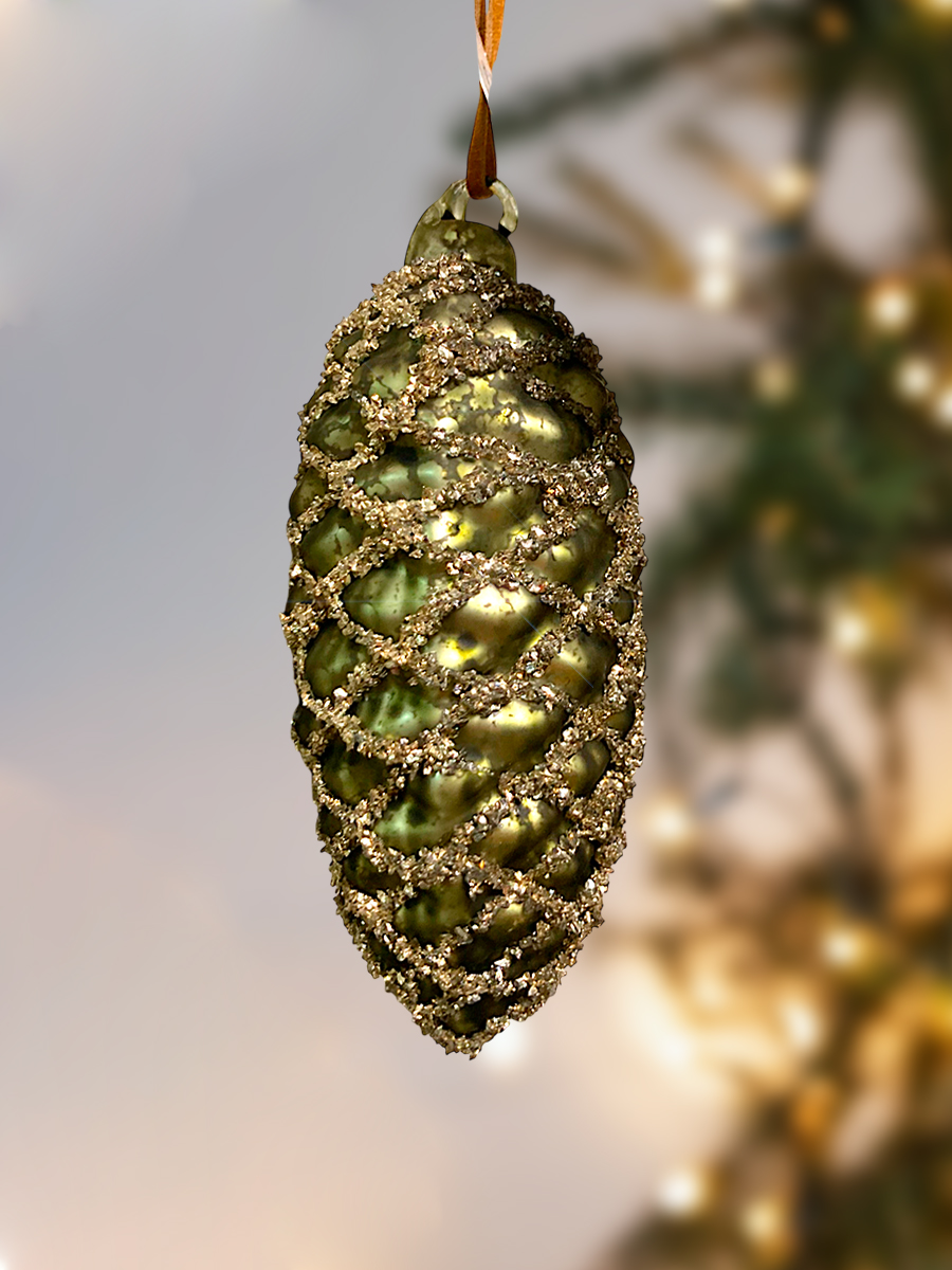 Игрушка елочная стекл. Шишка — в виде еловой шишки матового античного зелёного цвета. Украшение имеет рельефную поверхность. Еловые чешуйки изображены с помощью серебристых блёсток. Смотрится просто потрясающе. Если вы хотите по-настоящему удивить гостей и произвести на них впечатление, украсьте свою елку стеклянными игрушками. Сегодня елочные игрушки из пластика есть в каждом доме, а стеклянные — у единиц!