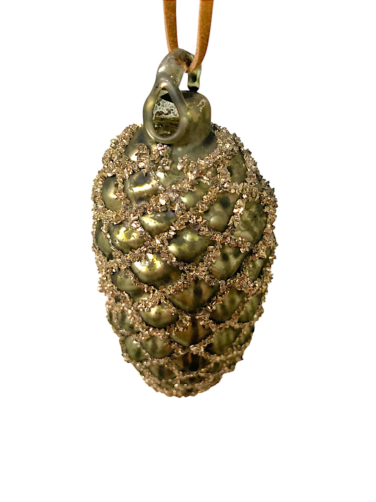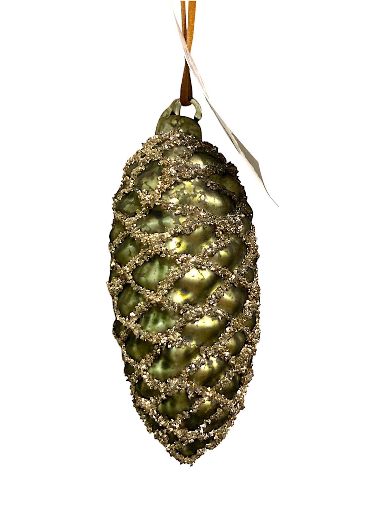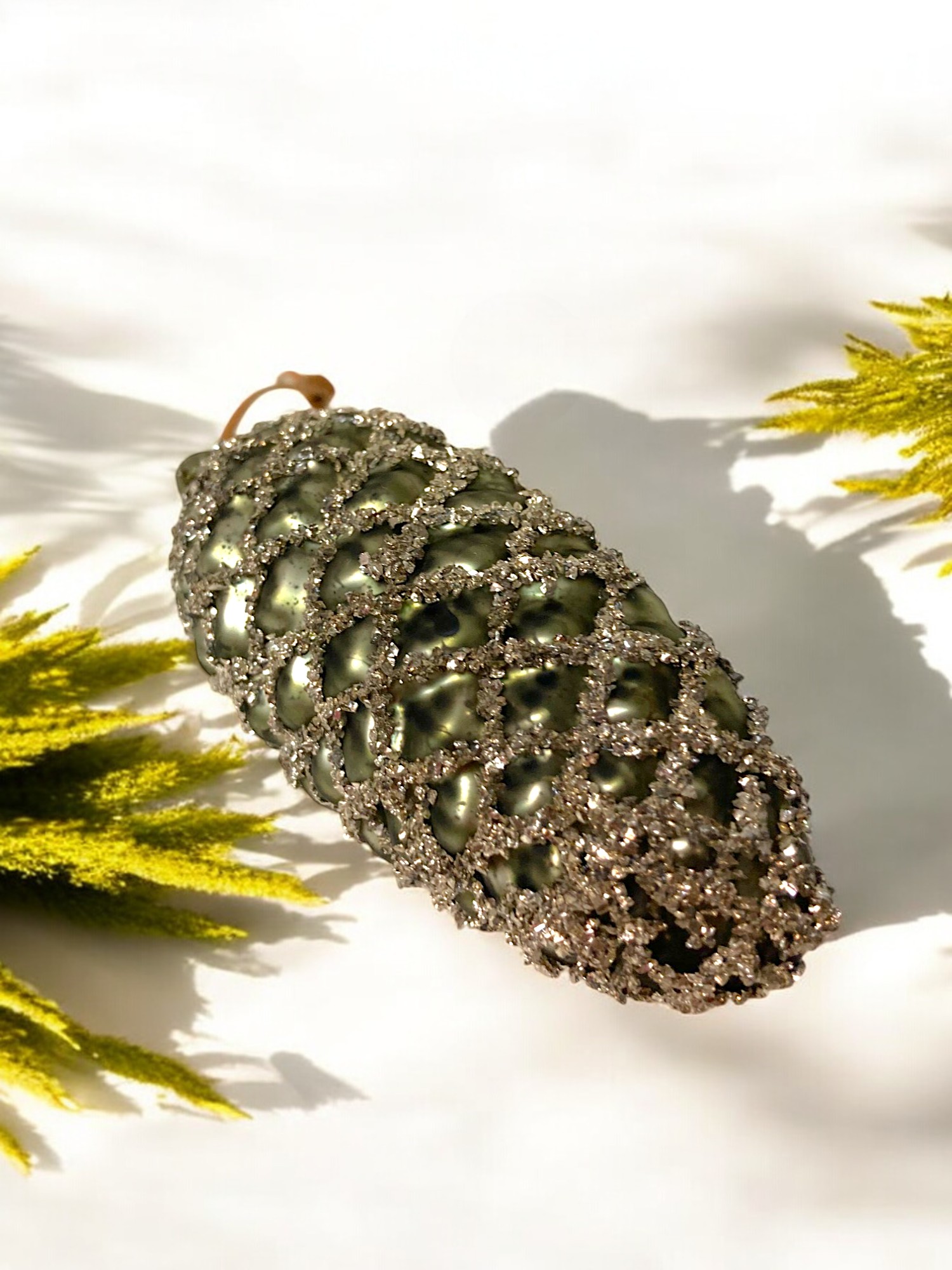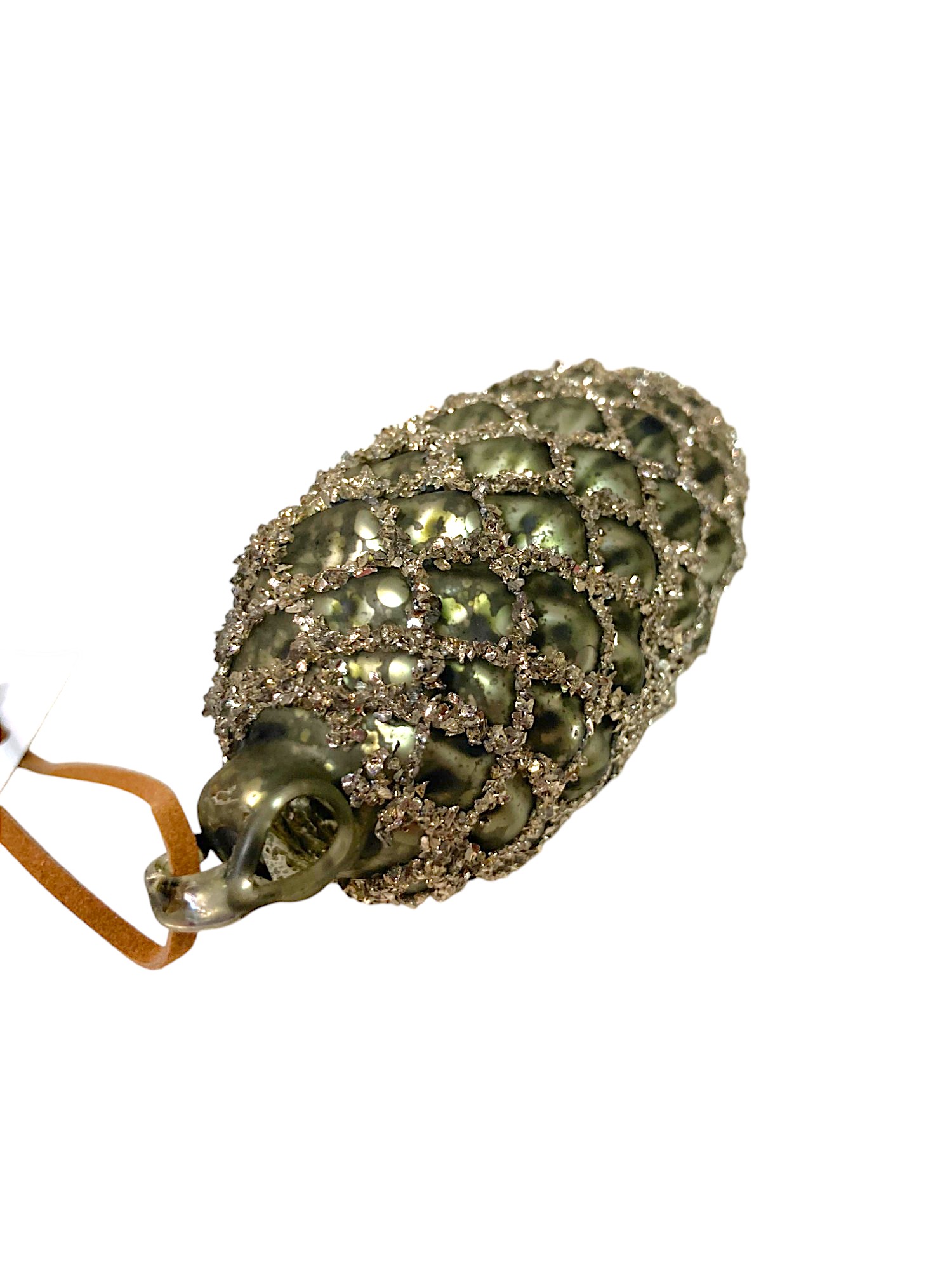 Игрушка елочная стекл. Шишка — в виде еловой шишки матового античного зелёного цвета. Украшение имеет рельефную поверхность. Еловые чешуйки изображены с помощью серебристых блёсток. Смотрится просто потрясающе. Если вы хотите по-настоящему удивить гостей и произвести на них впечатление, украсьте свою елку стеклянными игрушками. Сегодня елочные игрушки из пластика есть в каждом доме, а стеклянные — у единиц!