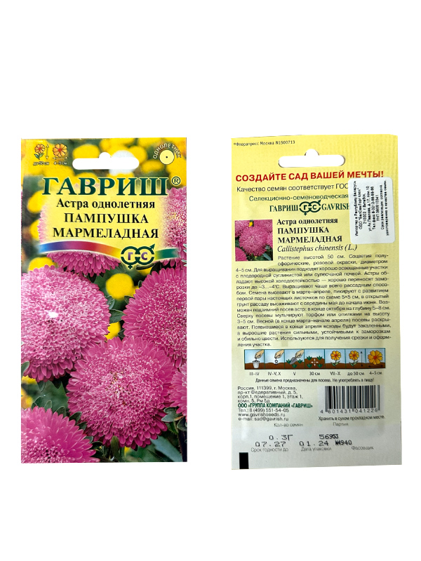 Семена астры Пампушка мармеладная, помпонная, 0.3гр. Растение высотой 50 см. Соцветия полусферические, розовой окраски, диаметром 4-5 см. Для выращивания подходят хорошо освещенные участки с плодородной суглинистой или супесчаной почвой. Астры обладают высокой холодостойкостью – хорошо переносят заморозки до -3-4оС. Выращивают чаще всего рассадным способом. Семена высевают в марте-апреле, пикируют с развитием первой пары настоящих листочков по схеме 5х5 см, в открытый грунт рассаду высаживают с середины мая до начала июня. Возможен подзимний посев астр: в конце октября на глубину 5-8 см. Сверху посевы мульчируют торфом или опилками на высоту 3-5 см. Весной (в конце марта-начале апреля) посевы раскрывают. Появившиеся в конце апреля всходы будут закаленными, а выросшие растения сильными, устойчивыми к заморозкам и обильно цвести. Используются для получения срезки и оформления участка.