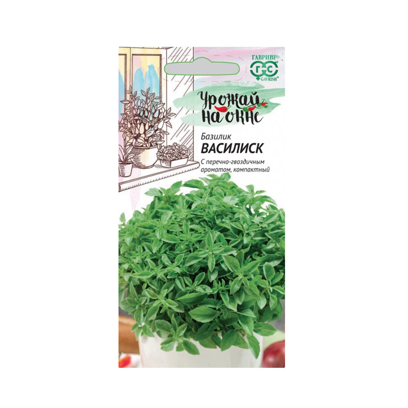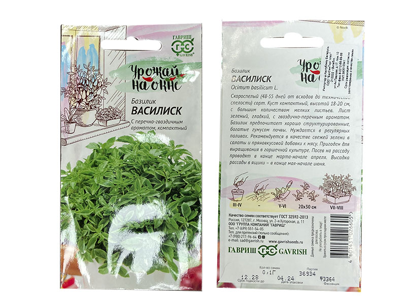 Семена базилика Василиск 0.1гр, из серии Урожай на окне. Скороспелый (60-70 дней от всходов до цветения) сорт. Посев на рассаду конец марта – начало апреля. Высадка рассады в грунт - начало июня. Схема посадки 30х30 см. Куст компактный, высотой 20-25 см, с большим количеством мелких листьев. Листья и стебель зеленые с перечно-гвоздичным запахом. Базилик предпочитает хорошо структурированные, богатые гумусом почвы. Нуждается в регулярных поливах. Используется в свежем виде в качестве салатной зелени и пряно вкусовой добавки, а также натурального ароматизатора в кулинарии и при консервировании.
