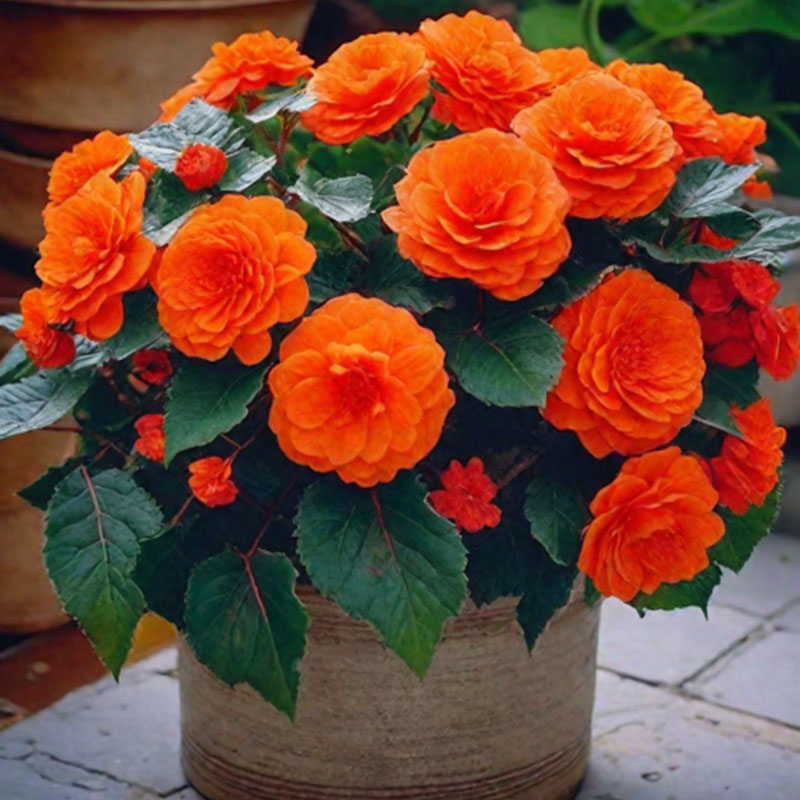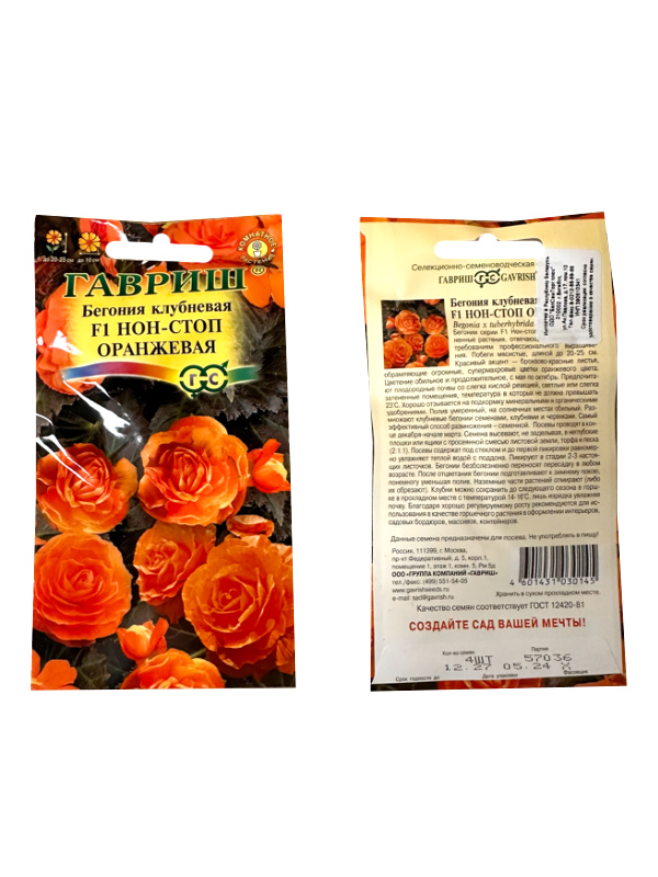 Семена бегонии клубневой Нон-стоп оранжевой. Бегонии серии F1 Нон-стоп – мощные выравненные растения, отвечающие самым высоким требованиям профессионального выращивания. Побеги мясистые, длиной до 20-25 см. Красивый акцент — бронзово-красные листья, обрамляющие огромные, супермахровые цветки оранжевого цвета. Цветение обильное и продолжительное, с мая по октябрь. Предпочитают плодородные почвы со слегка кислой реакцией, светлые или слегка затененные помещения, температура в которых не должна превышать 23 °C. Хорошо отзывается на подкормку минеральными и органическими удобрениями. Полив умеренный, на солнечных местах обильный. Размножают клубневые бегонии семенами, клубнями и черенками. Самый эффективный способ размножения – семенной. Посевы производят в конце декабря – начале марта. Семена высевают, не заделывая в неглубокие плошки или ящики с просеянной смесью листовой земли, торфа или песка (2:1:1). Посевы содержат под стеклом и до первой пикировки равномерно увлажняют теплой водой с поддона. Пикируют в стадии 2-3 настоящих листочков. Бегонии безболезненно переносят пересадку в любом возрасте. После отцветания бегонии подготавливают к зимнему покою, понемногу уменьшая полив. Наземные части растений отмирают (либо их обрезают). Клубни можно сохранить до следующего сезона в горшке в прохладном месте с температурой 14-16 °C, лишь изредка увлажняя почву. Благодаря хорошо регулируемому росту рекомендуются для использования в качестве горшечного растения в оформлении интеръеров, садовых бордюров и массивов, контейнеров.