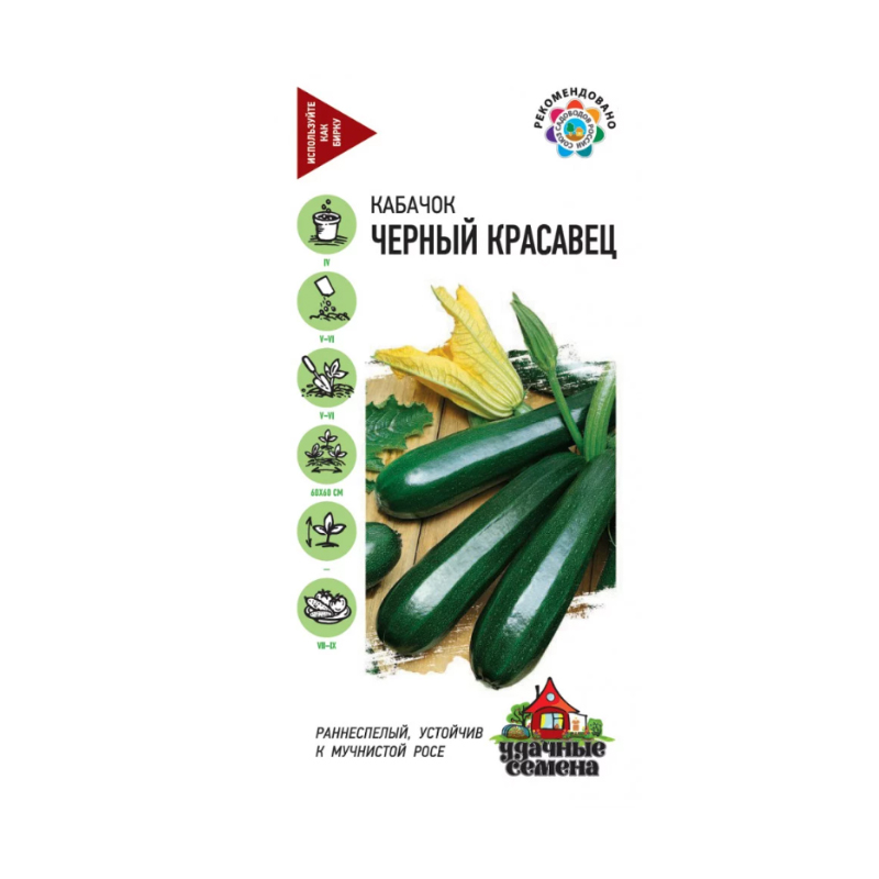 Семена кабачка Черный красавец 2гр, серия Удачные семена. Раннеспелый (40–45 дней от всходов до созревания) сорт. Растение кустовое. Плод цилиндрический, темно-зеленый, без пятнистости, ребристый, сильноглянцевый, массой 0,8–1,7 кг. Кора средней толщины. Мякоть светло-бежевая, плотная, сочная. Сорт ценится за нежный вкус плодов и высокую устойчивость к мучнистой росе. Молодые завязи (10–15 см) используют в свежем виде в салатах. Зрелые плоды хранятся до 10 месяцев. Урожайность 7,0–9,7 кг/м2.
