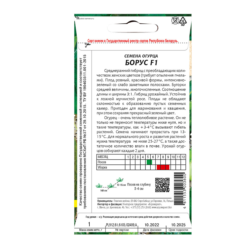 Среднеранний гибриде преобладающим количеством женских цветков (требует опыления пчелами). Плод ровный, красивой формы, интенсивно-зеленый со слабо заметными полосками. Бугорки средней величины, многочисленные. Соотношение длины и ширины 3:1. Гибрид урожайный. Устойчив к ложной мучнистой росе. Плоды не обладают склонностью к образованию пустых семенных камер. Пригоден для маринования и квашения, при этом сохраняя прекрасный зеленый цвет.