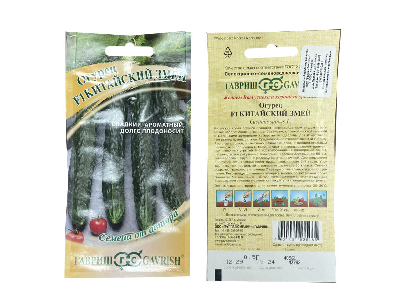 Семена огурца Китайский змей F1 0.5гр, из серии Семена от автора. Среднепоздний пчелоопыляемый гибрид с продоложительным периодом плодоношения для выращивания под временными пленочными укрытиями. Растение мощное, интенсивно развивающееся. Зеленец длинный (50-60 см), змеевидный, темно-зеленый, крупно-, редкобугорчатый, с короткой ручкой. Плоды с сильным ароматом, сладкие, сочные, без пустот, с тонкой нежной кожицей и маленькими семенными камерами, незаменимы для приготовления летних салатов. Сорт требователен к плодородию почвы, рекомендуются регулярные подкормки. Посев на рассаду — в конце апреля. Высадка рассады в грунт — в конце мая – начале июня в фазе 3-4-х настоящих листьев. Посев непосредственно в грунт – в мае – июне. Схема посадки: 50х100 см. Для повышения продуктивности главный побег прищипывают после 6-7 листа. Урожайность при правильной агротехнике достигает 30 кг/м2.