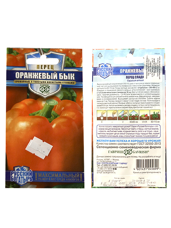 Семена перца сладкого Оранжевый бык, семена серии Русский богатырь. Перец сладкий — популярная овощная культура, которую выращивают и дачники, и фермерские хозяйства. В нем содержится масса витаминов и полезных веществ, незаменимый ингредиент в кулинарии: приготовлении свежих салатов, гарниров, подлив и заготовок впрок. Высокоурожайный ранний (100-110 дней от всходов до начала плодоношения) сорт для выращивания под временными пленочными укрытиями и в открытом грунте. Формирует куст высотой 80-110 см. Плоды крупные, массой 250 г (отдельные до 300-400 г), кубовидные, с толстыми мясистыми стенками до 10 мм. Незрелые перцы зеленого цвета, зрелые — ярко-оранжевого. Сорт устойчив к вирусу табачной мозаики. Товарная урожайность — 7,0-14,0 кг/м² (в зависимости от условий выращивания). Используют в свежем виде, фаршируют, замораживают и консервируют. Выращивают рассадным способом. Глубина заделки семян до 1 см. Рассаду пикируют в фазе 1-2 настоящих листьев. После высадки в теплицу у растений удаляют боковые побеги и листья до первой развилки и подвязывают к опоре. Нельзя высаживать рассаду сладких и острых сортов перца рядом, т.к. происходит переопыление и сладкий перец приобретает горький вкус.