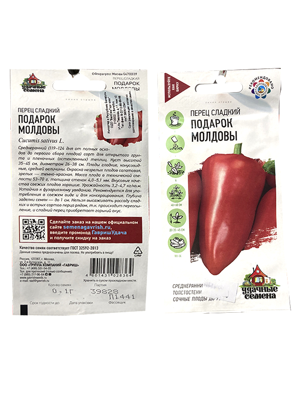 Семена перца сладкого Подарок Молдовы 0.1гр, семена серии Удачные семена. Среднеранний (119-124 дней от полных всходов до первого сбора плодов) сорт, для открытого грунта и пленочных (остекленных) теплиц. Куст высотой 35-45 см, диаметром 26-38 см. Плоды гладкие, конусовидные, средней величины. Окраска в технической спелости салатная, в биологической - темно-красная. Масса плода в технической спелости 53-70 г, толщина стенок 4,0-5,1 мм. Вкусовые качества свежих плодов хорошие. Урожайность 3,2-4,7 кг/м2. Устойчив к фузариозному увяданию. Рекомендуется для употребления в свежем виде и для консервирования.