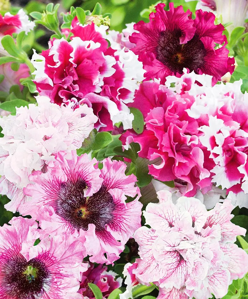 Огромные бахромчатые цветки диаметром 16 см белые с пятнами от розового до темно-фиолетового цвета. Растения мощные, высокие, слабо ветвящиеся, достигают 40-50 см. Идеально смотрится на клумбах, рабатках и бордюрах, а также в ящиках и горшках. Хорошо растут на солнечных местах. Необходимы регулярные подкормки минеральными комплексными удобрениями, с повышенным содержанием калия. Цветут до заморозков.