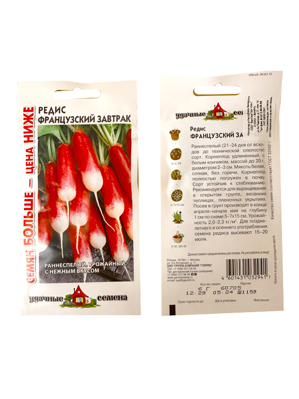 Семена редиса Французский завтрак 6гр, серия Удачные семена, Семян больше. Раннеспелый (21-24 дня от всходов до технической спелости) сорт. Корнеплод удлиненный, с белым кончиком, массой до 20 г, диаметром 2-3 см. Мякоть белая, сочная, без горечи. Корнеплод полностью погружен в почву. Сорт устойчив к стеблеванию. Рекомендуется для выращивания в открытом грунте, весенних теплицах, пленочных укрытиях. Посев в грунт производится в конце апреля-начале мая, июле на глубину 1 см по схеме 5-7х15 см. Урожайность 2,0-2,3 кг/м2.