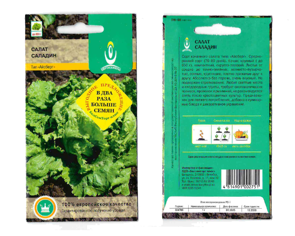 Семена салата айсберг Саладин, 1гр. Сорт кочанного салата типа «Айсберг». Среднеранний сорт (70–80 дней). Кочан: крупный ( до 650 г), компактный, округло-плоский. Листья от средне до темно-зелёных, волнисто-пузырчатые, сочные, хрустящие, плотно прижатые друг к другу. Абсолютно без горечи, очень вкусный. Не подвержен стрелкованию. Любит светлые места и плодородные грунты, требует систематических поливов, прополок и рыхлений, не рекомендуется сеять после крестоцветных культур. Предназначен для свежего потребления, добавка в кулинарные блюда и декоративное украшение.