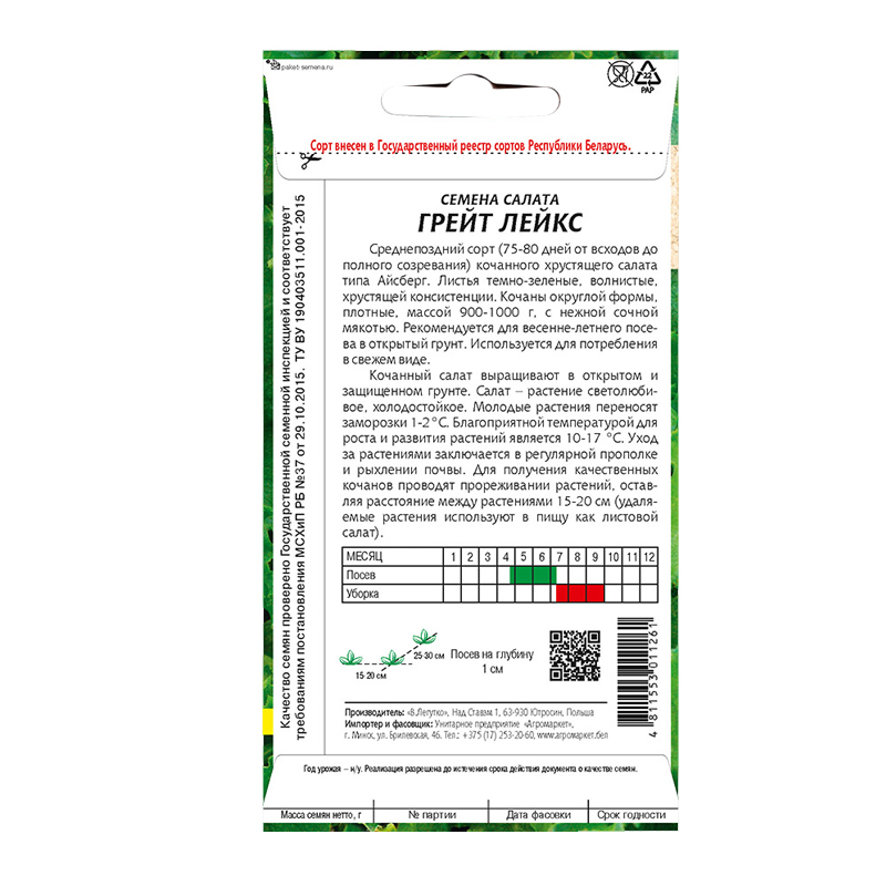 Среднепоздний сорт (75-80 дней от всходов до полного созревания) кочанного хрустящего салата типа Айсберг. Листья темно-зеленые, волнистые, хрустящей консистенции. Кочаны округлой формы, плотные, массой 900-1000 г, с нежной сочной мякотью. Рекомендуется для весенне-летнего посева в открытый грунт. Используется для потребления в свежем виде.