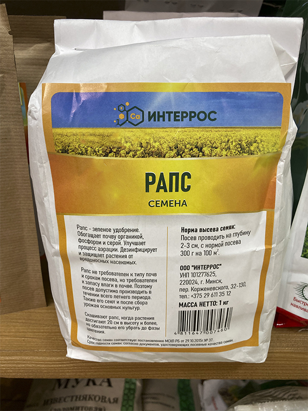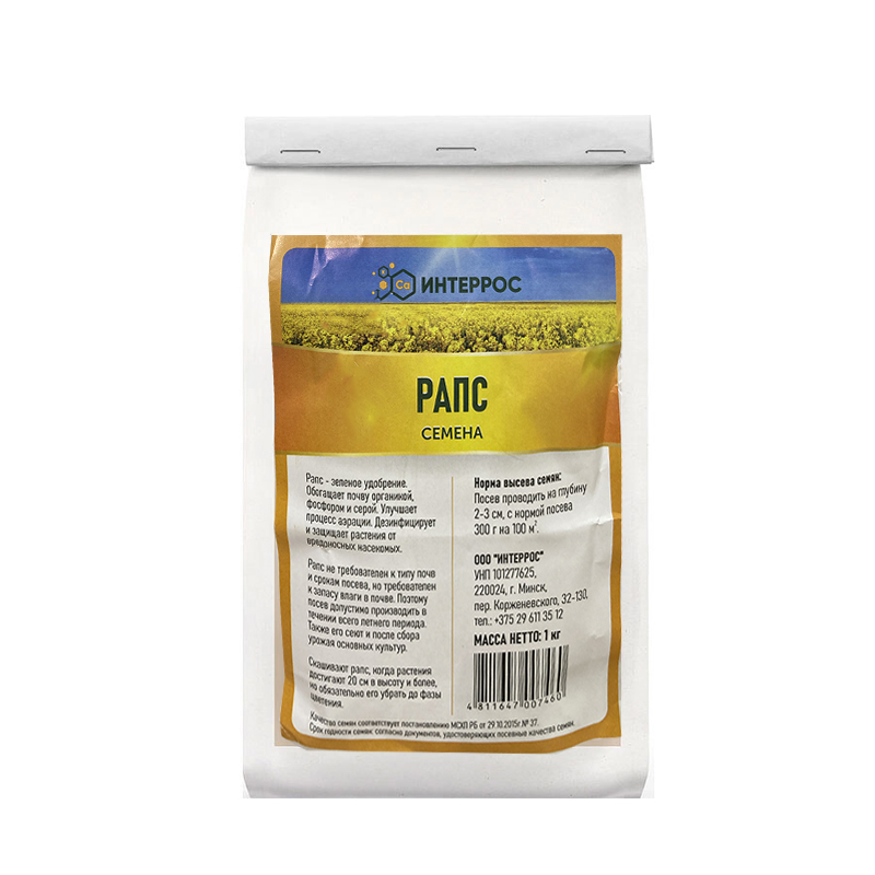 Рапс - зеленое удобрение. Обогащает почву органикой, фосфором и серой. Улучшает процесс аэрации. Дезинфицирует и защищает растения от вредоносных насекомых. Рапс не требователен к типу почвы и срокам посева, но требователен к запасу влаги в почве. Поэтому посев допустимо производить в течении всего летнего периода. Также его сеют и после сбора урожая основных культур. Скашивают рапс когда растения достигают 20 см в высоту и более, но обязательно его убрать до фазы цветения.