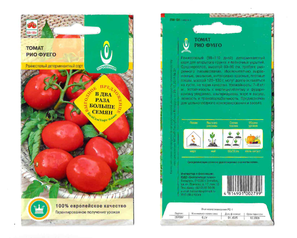 Семена томата Рио Фуего, 0.2гр. Раннеспелый (98–110 дней) детерминантный сорт для открытого грунта и плёночных укрытий. Среднерослое, высотой 60–90 см, требует умеренного пасынкования. Исключительно выравненные, овальные, интенсивно-красные, плотные плоды, массой 120–130 г, могут долго оставаться на кусте, не теряя качества. Урожайность: 7–8 кг/м². Устойчивость к вертициллёзному и фузариозному увяданию, альтернариозу, жаре и засухе, лежкость и транспортабельность. Предназначен для цельноплодного консервирования и засола.