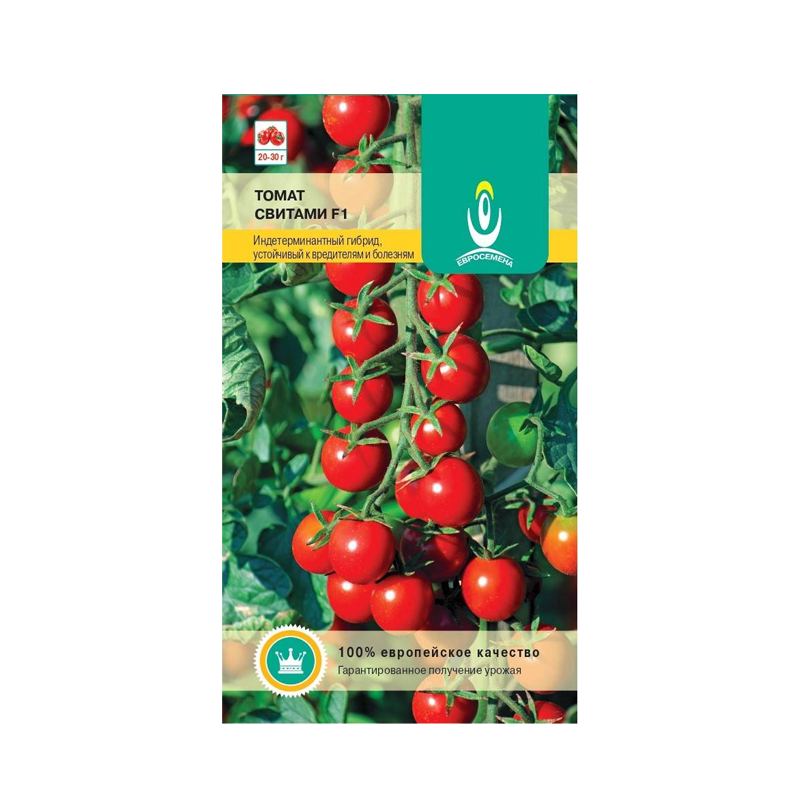 Семена томата Свитами F1, 0.2гр. Индетерминантный ультраскороспелый гибрид, устойчивый к вредителям и болезням.Плоды созревают через 75–83 дня после посева семян. Образует высокие крепкие кусты. Не относится к штамбовым. В период созревания растение выглядит очень нарядно. За красоту и вкусные плоды оно получило название «конфетное дерево». Можно выращивать в теплицах или в грунте под плёнкой, возможно содержание в горшках и вазонах на балконах и верандах. Плоды: собраны в крупную кисть, на каждой созревает от 30 до 50 помидоров. Томаты шарообразные, ровные, насыщенно-красного, жёлтого или оранжевого цвета. Вкус очень приятный, сладковатый, мякоть нежная, но плотная. Содержание сахаров и сухих веществ доходит до 12%. Созревание дружное, что позволяет собирать помидоры кистями. Вес плода — 20–30 г. Урожай хорошо хранится.