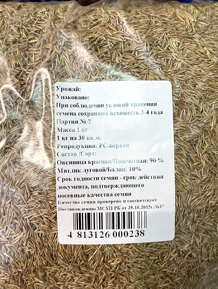 Состав: овсяница красная (пяшчотная) 90%, мятник луговой (балин) 10%
