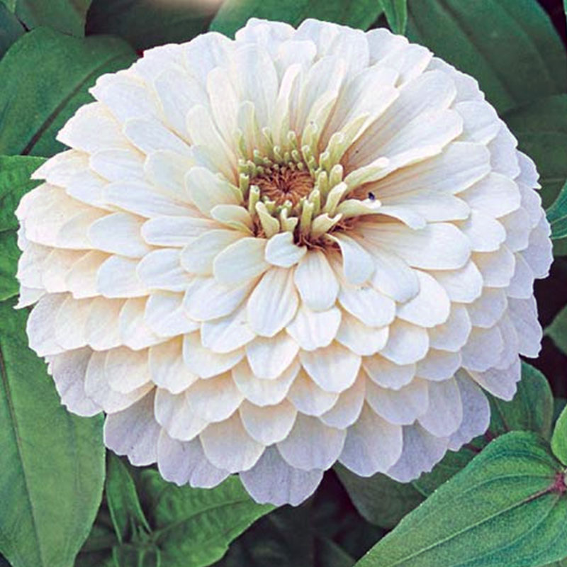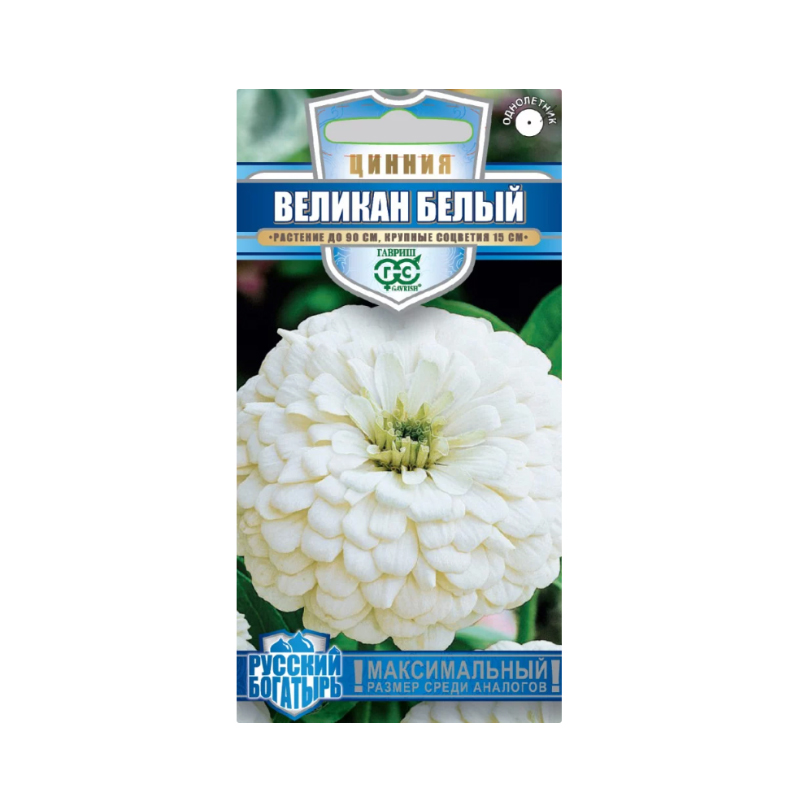 Семена циннии Великан белый, серия Русский богатырь. Серия высокорослых крупноцветковых цинний для элитного оформления сада. Отличается чрезвычайно обильным и продолжительным цветением, прочными ветвящимися цветоносами, чистыми и стойкими к выгоранию тонами соцветий. Формирует приподнятые, разветвленные кусты высотой до 90 см. Соцветия георгиновидные, крупные, белые, 15 см в диаметре, с высокой устойчивостью к неблагоприятным погодным условиям. Цветет с июня до заморозков. Циннии светолюбивы, засухоустойчивы и теплолюбивы; отзывчивы на полив, без длительного полива снижается интенсивность цветения и уменьшается размер соцветий. Выращивают рассадным способом. Семена высевают в апреле. Всходы появляются через 4-6 дней. В начале июня растения высаживают на расстоянии 20 см.