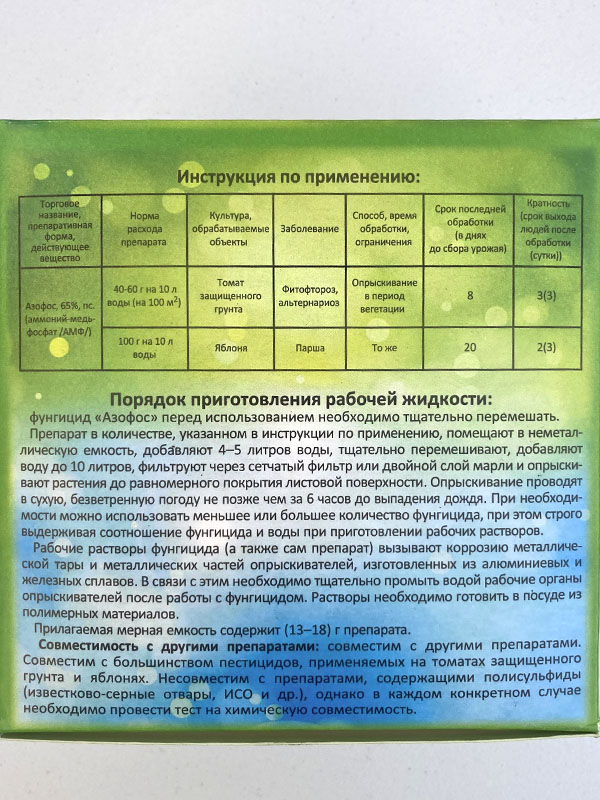 Одним из ключевых преимуществ «Азофоса» является его способность обеспечивать некорневую подкормку растений за счет усваиваемых соединений азота, фосфора и микроэлементов. Это дополнительно способствует повышению урожайности и сохранности продукции. В составе препарата содержатся медь сульфата, аммофос и карбамид, что делает его идеальным решением для комплексного ухода за растениями. После обработки «Азофосом» препарат не проникает внутрь растения, а создает защитную пленку на поверхности стеблей и листьев. Это позволяет эффективно защищать растения от грибковых заболеваний, не нарушая их физиологические процессы. Регулярное использование «Азофоса» позволяет поддерживать здоровье растений, улучшая их иммунитет и устойчивость к неблагоприятным условиям.