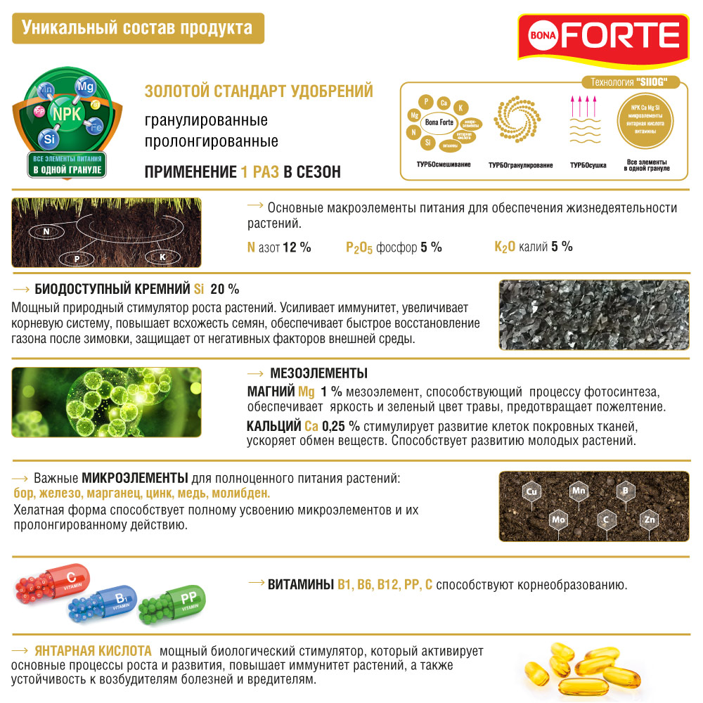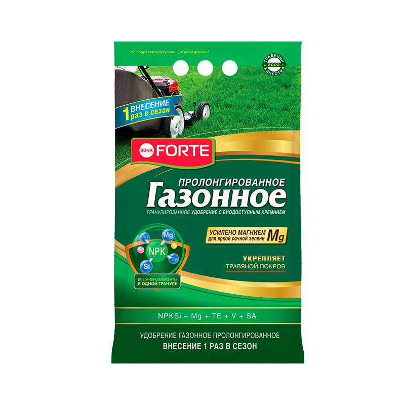 Удобрение для газона Bona Forte пролонгированное с биодоступным кремнием быстро восстановит газон после зимы, обеспечит густое и яркое покрытие. Эффективно для различных типов почв, хорошо усваивается растениями и препятствует распространению грибковых заболеваний. Пролонгированное действие – благодаря входящему в состав удобрения цеолиту удобрение не вымывается со временем (одного внесения хватает на весь сезон). Хорошая растворимость – удобрение начинает действовать моментально. Вносится 1 раз за сезон.