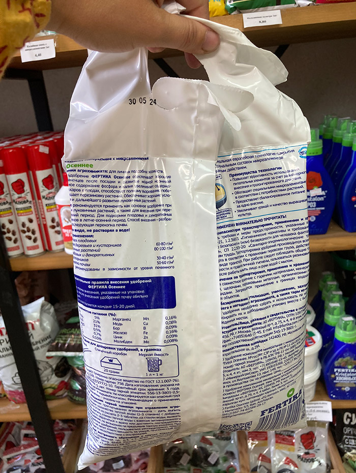 Комплексное гранулированное удобрение. Рекомендуется для плодовых и декоративных деревьев и кустарников, луковичных культур. Содержит повышенное количество фосфора и калия, которые особенно необходимы растениям в осенний период. Обеспечивает хорошую приживаемость саженцев после посадки и формирование мощной корневой системы. Обеспечивает благоприятные условия для укоренения и дальнейшего развития луковичных растений. Способствует полному вызреванию побегов, успешной перезимовке растений и лучшему развитию плодовых почек.