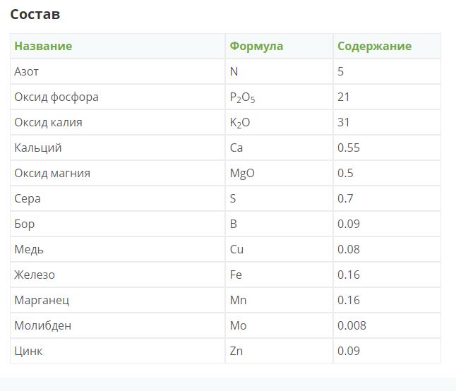 Состав: Азот - 5, Оксид фосфора - 21, Оксид калия - 31, Кальций - 0.55, Оксид магния - 0.5, Сера - 0.7, Бор - 0.09, Медь - 0.08, Железо - 0.16, Марганец - 0.16, Молибден - 0.008, Цинк - 0.09