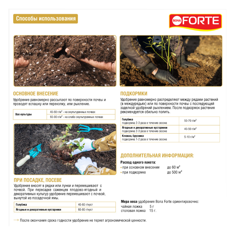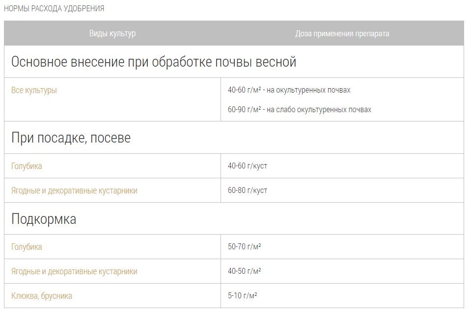 Клюква, брусника - подкормка 1-2 раза в течение сезона. - При посеве и посадке земляники - Удобрение вносят в рядки или лунки и перемешивают с почвой. При пересадке саженцев плодово-ягодный и декоративных культур удобрение перемешивают с почвой, вынутой из посадочной ямы.