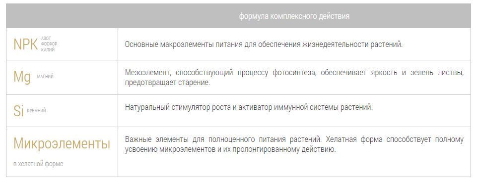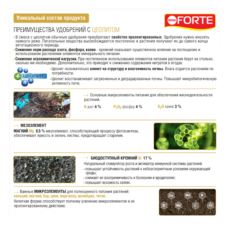Кремний, наряду с азотом, фосфором и калием, является абсолютно необходимым элементом для полноценного развития растений. Природные цеолиты являются также источником мезо- и микроэлементов (кальция, магния, бора, цинка, марганца, молибдена), которые необходимы для полноценного питания растений. Удобрение содержит основные элементы питания в легкоусвояемой форме и сбалансированном соотношении, способствует хорошему росту растений и получению высокого урожая.