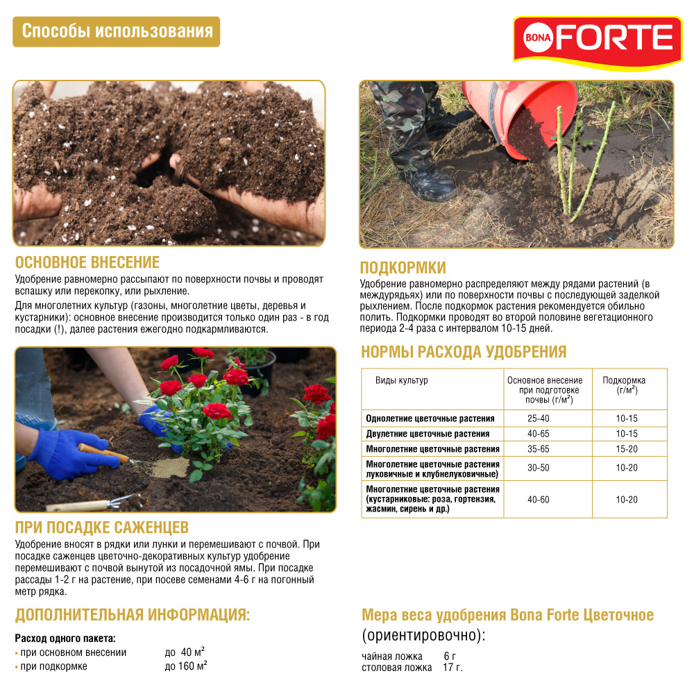 - При посеве и посадке. Удобрение вносят в рядки или лунки и перемешивают с почвой. При посадке саженцев цветочно-декоративных культур удобрение перемешивают с почвой вынутой из посадочной ямы. При посадке рассады 1-2 г на растение, при посеве семенами 4-6 г на погонный метр рядка.