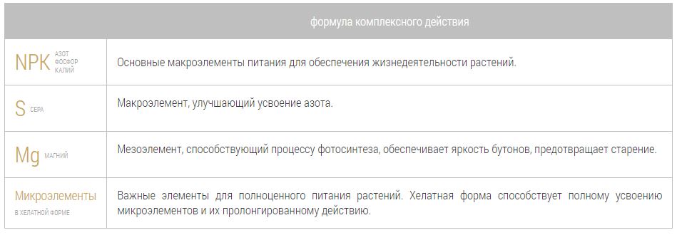 - Шесть микроэлементов: бор, железо, марганец, цинк, медь, молибден. Микроэлементы находятся в хелатной (легкоусваиваемой) форме.
