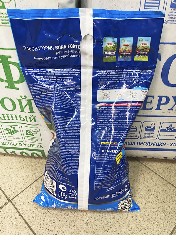 - Три основных макроэлемента (NPK): азот (N) - 8 %, фосфор (P2O5) - 20 %, калий (K2O) - 30 %