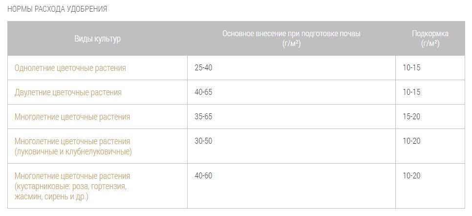 Для многолетних культур (газоны, многолетние цветы, деревья и кустарники): основное внесение производится только один раз - в год посадки (!), далее растения ежегодно подкармливаются.