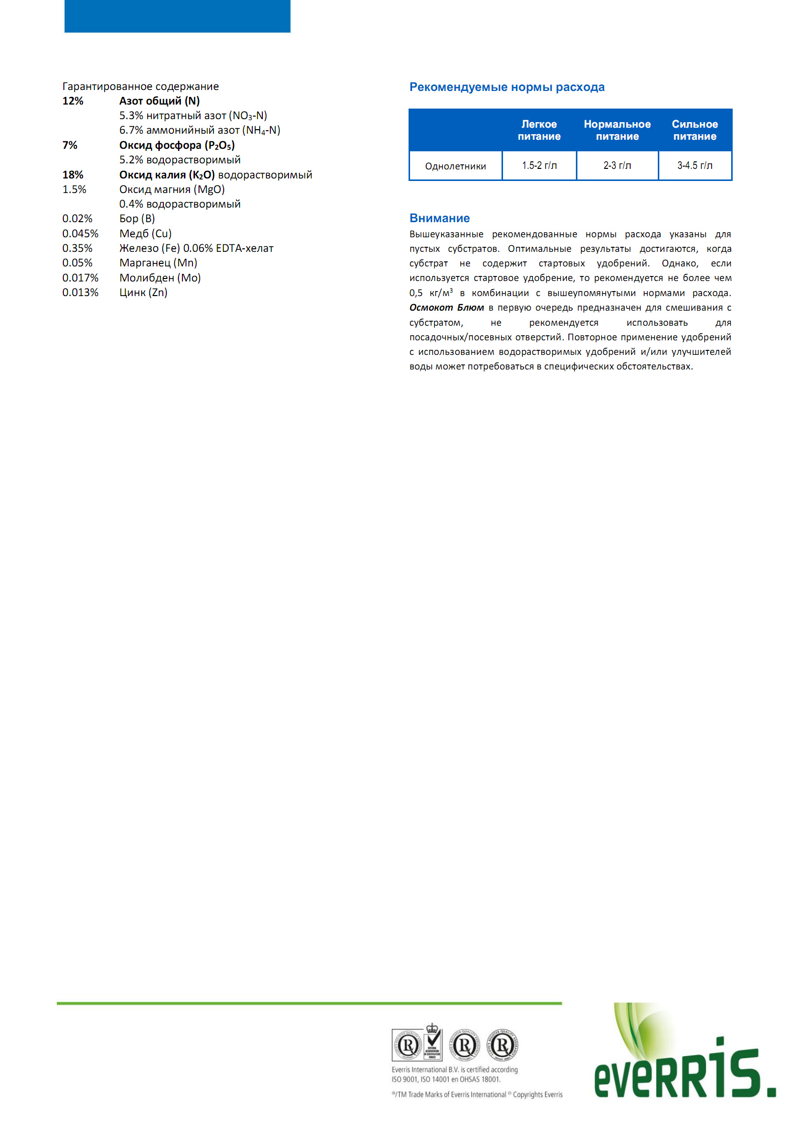 - N — 12% общий азот (в т.ч. 5,3% нитратный азот, 6,7% амонийный азот)