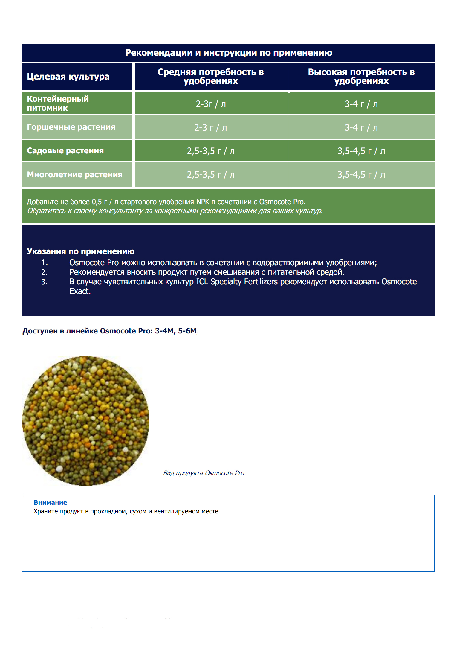 Osmocote Pro - это специализированное удобрение ICL Specialty Fertilizers второго поколения с покрытием. Оно полностью состоит из NPK, магния и всех необходимых микроэлементов. Кроме того, оно имеет фиксированную продолжительность действия от 3 - 4 месяцев до 12 - 14 месяцев. Osmocote Pro имеет регулярную схему высвобождения и оранжево-белую цветовую кодировку на всех сроках действия. Его можно использовать в полной норме или в базовой норме в сочетании с водорастворимыми удобрениями.