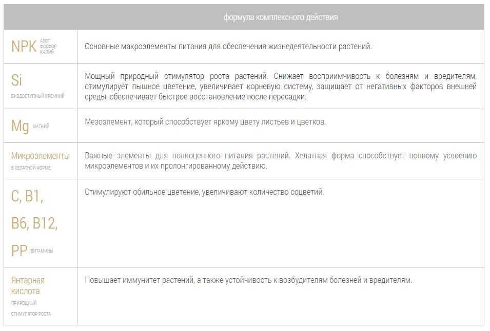 - Три основных макроэлемента (NPK): азот (N) - 7.5 %, фосфор (P2O5) - 7 %, калий (K2O) - 7.5 %, Si: биодоступный кремний - 20%.