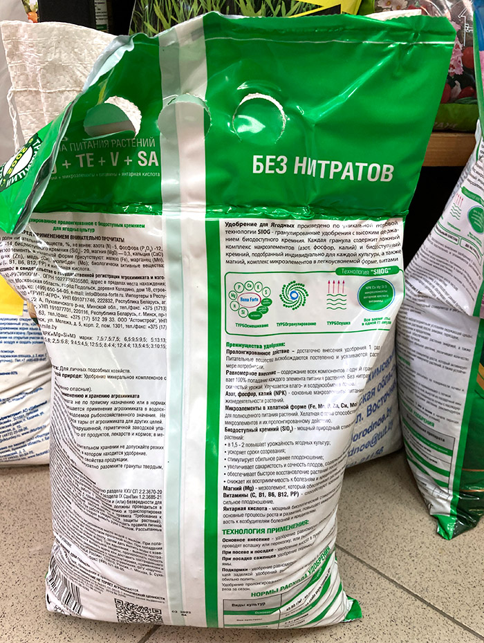 - Пролонгированное действие – благодаря входящему в состав удобрения цеолиту удобрение не вымывается со временем (одного внесения хватает на весь сезон).