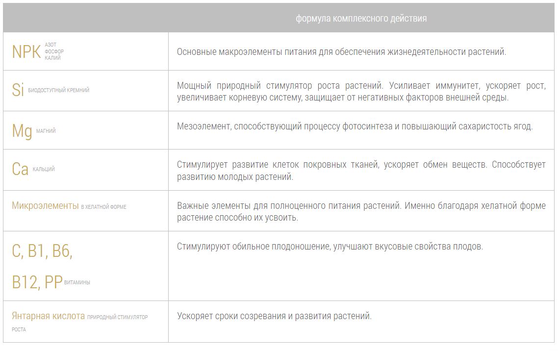 - Три основных макроэлемента (NPK): азот (N) - 5 %, фосфор (P2O5) - 12 %, калий (K2O) - 14 %, Si: биодоступный кремний - 20%.